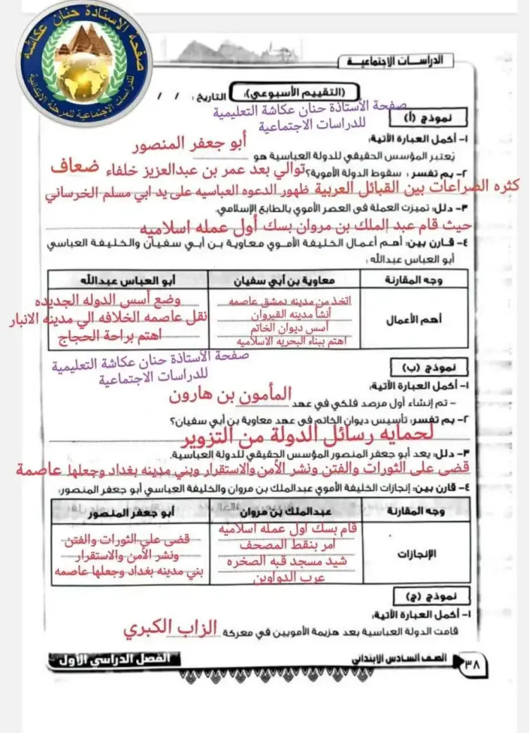 يتضمن حل الأداء الصفي دراسات سادسة ابتدائي الأسبوع الحادي عشر ترم أول 2026 الإجابة النموذجية عن كافة الأسئلة، ومن بينها كان الآتي:
