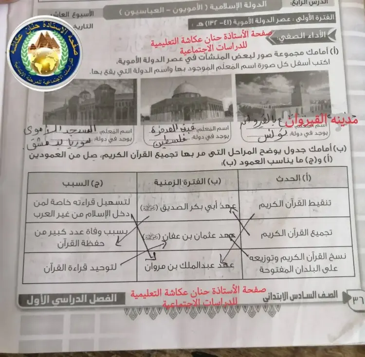 حل الأداء الصفي دراسات سادسة ابتدائي الأسبوع الحادي عشر ترم أول 2026
