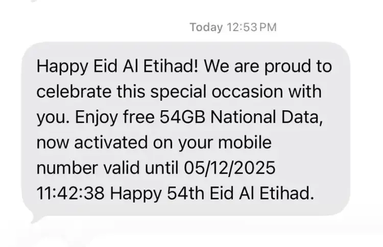 «عيد اتحاد سعيد! فخورون بمشاركتكم الاحتفال بهذه المناسبة المميزة. استمتع بـ 54 جيجابايت من البيانات المحلية المجانية، تم تفعيلها الآن على رقم هاتفك وصالحة لغاية 05/12/2025 الساعة 11:42:38. تهانينا بمناسبة عيد الاتحاد الـ 54».