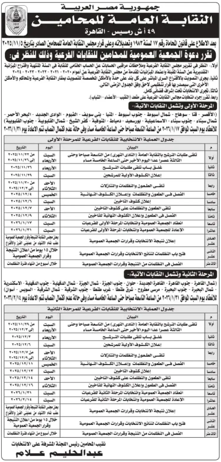 حدد إعلان رسمي صادر عن النقابة العامة للمحامين الجدول الزمني التفصيلي لانعقاد الجمعيات العمومية لانتخابات نقابة المحامين الفرعية للمرحلتين الأولى والثانية لعام 2026.
