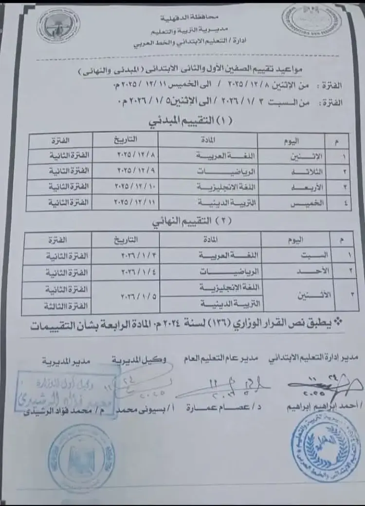 صدر الجدول من إدارة التعليم الابتدائي والخط العربي بمديرية التربية والتعليم بمحافظة الدقهلية، حيث نص على مواعيد التقييمات وفقا للآتي: