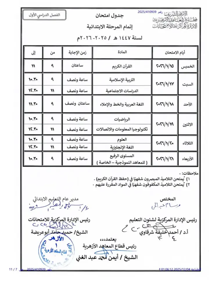 جدول امتحانات الصف السادس الابتدائي الأزهري الترم الأول 2025 2026