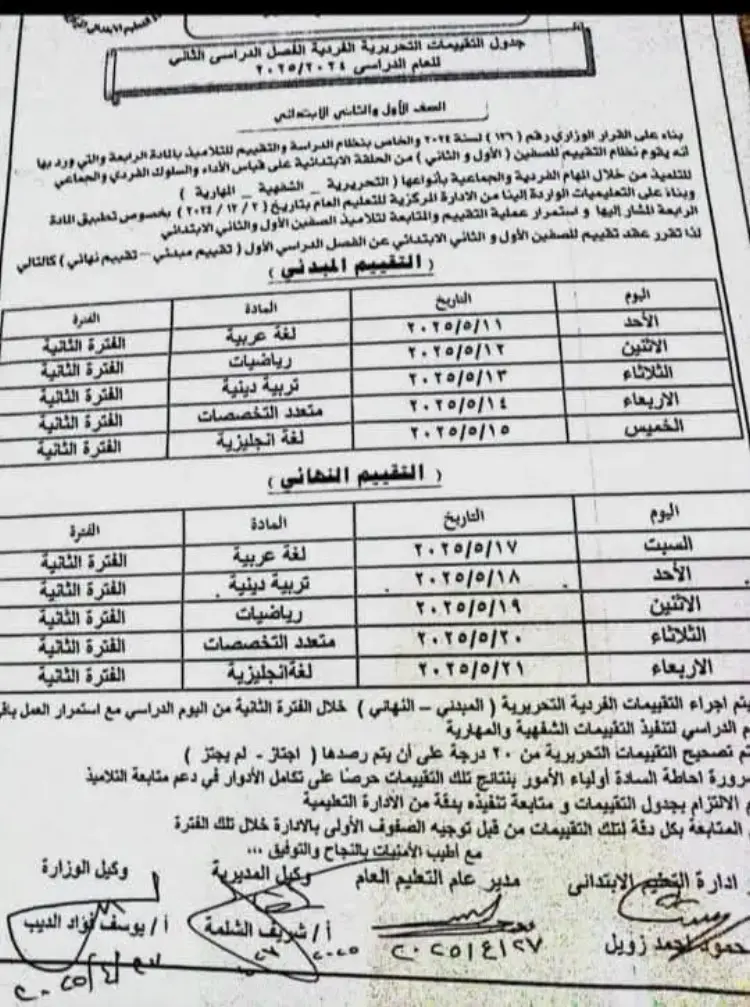 يُنفذ إجراء التقييمات الفردية التحريرية (المبدئي – النهائي) خلال الفترة الثانية من اليوم الدراسي، مع استمرار العمل بنظام التقييمات الشفهية والمهارية.