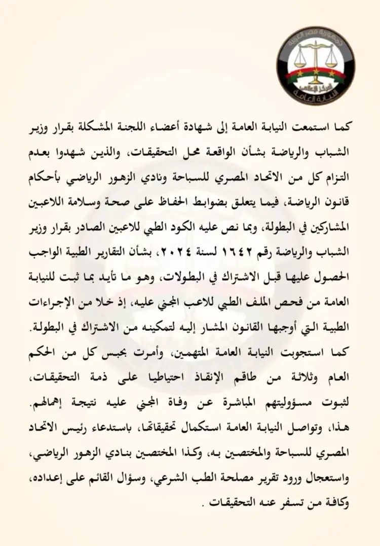 تأكدت النيابة من وجود إهمال وتقصير جسيم من جهة المتهمين، في حادث كشف عن جوانب قصور تتعلق بضوابط السلامة والإجراءات التنظيمية خلال البطولة.
