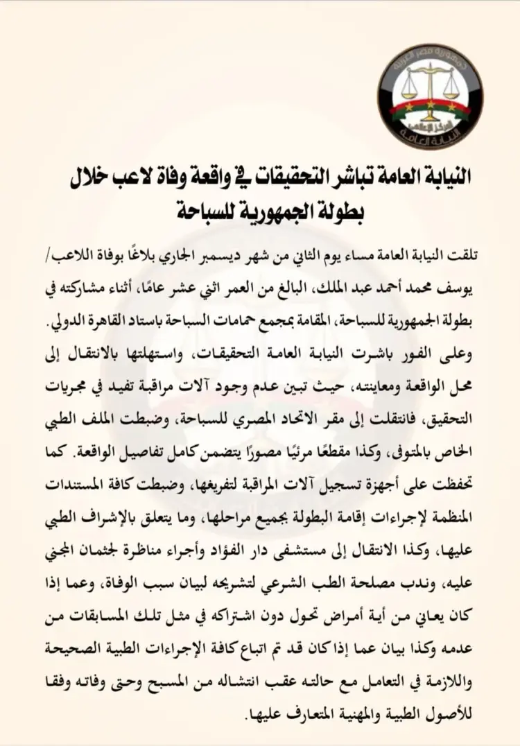 أسفرت تحقيقات النيابة العامة المصرية عن تطورات جديدة في قضية وفاة السباح يوسف محمد، البالغ من العمر 12 عاما، أثناء مشاركته في بطولة الجمهورية للسباحة المقامة بمجمع حمامات السباحة باستاد القاهرة الدولي.