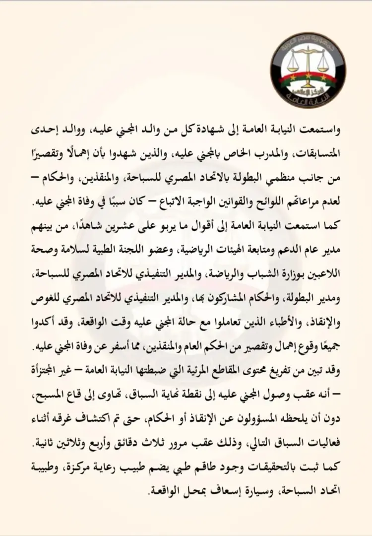 أوضح البيان أن النيابة استمعت أيضا إلى أقوال ما يربو على 20 شاهدا، من بينهم مدير عام الدعم ومتابعة الهيئات الرياضية، وعضو اللجنة الطبية لسلامة وصحة اللاعبين بوزارة الشباب والرياضة، والمدير التنفيذي للاتحاد المصري للسباحة، ومدير البطولة، والحكام المشاركون بها، والمدير التنفيذي للاتحاد المصري للغوص والإنقاذ، والأطباء الذين تعاملوا مع حالة الغريق وقت الواقعة.