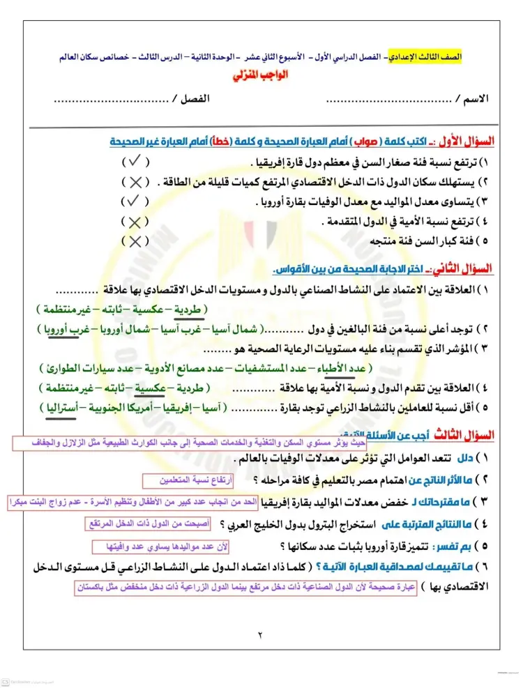 حل الأداء الصفي وواجب وتقييم الأسبوع الثاني عشر دراسات للصف الثالث الإعدادي ترم أول 2026