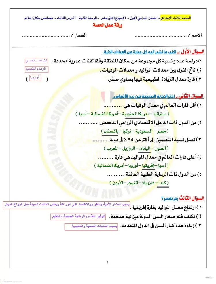 السؤال: بم تفسر ارتفاع معدل المواليد بقارة إفريقيا؟ الإجابة: بسبب انتشار الأمية والفقر والاعتماد على الزراعة وبعض العادات السيئة مثل الزواج المبكر.