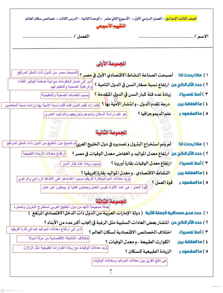 يتوفر في ملف حل التقييم الأسبوعي دراسات ثالثة إعدادي الأسبوع الثاني عشر ترم أول 2026 الإجابات والأسئلة التي أجاب عنها المدرسون، ومن بينها كان الآتي: