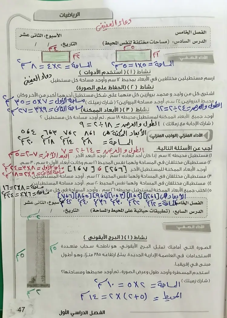 حل الأداء الصفي رياضيات ثالثة ابتدائي الأسبوع الثاني عشر ترم أول 2026