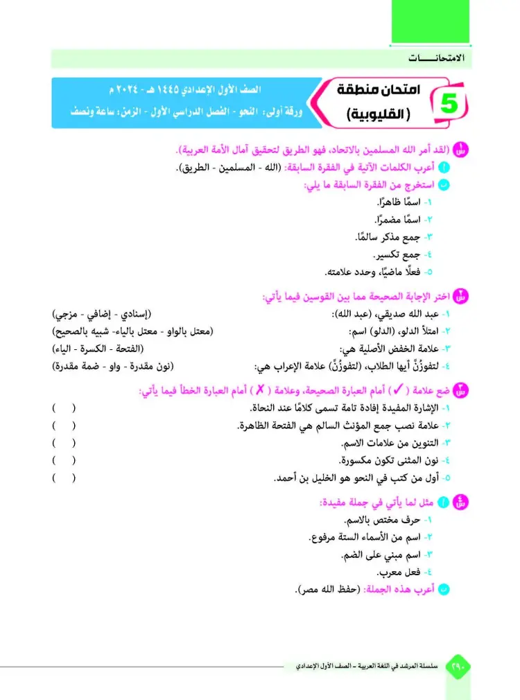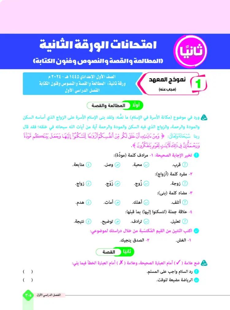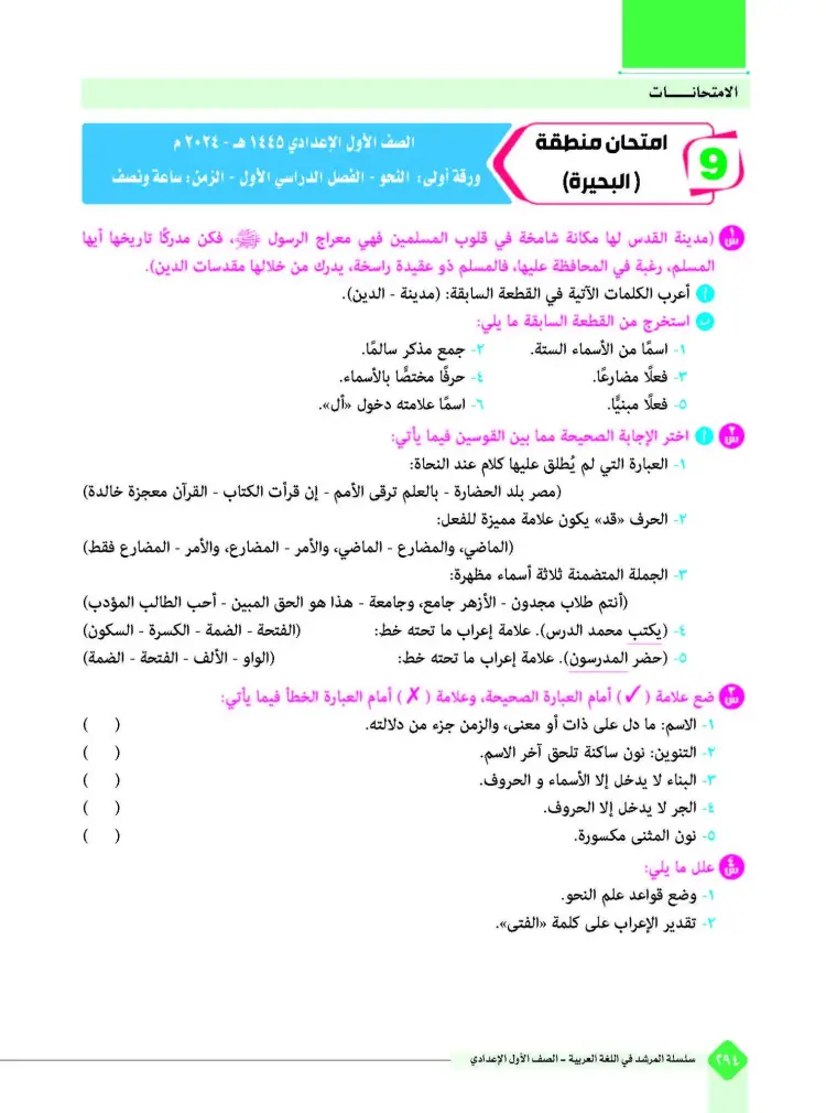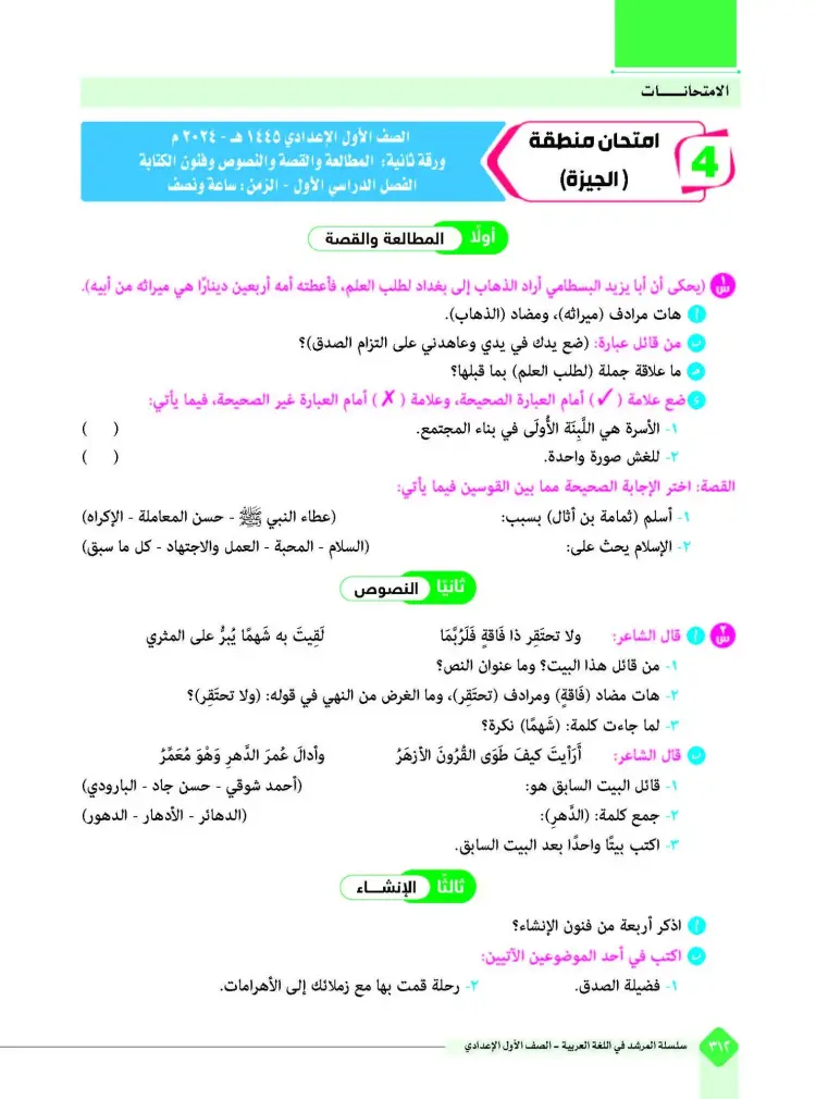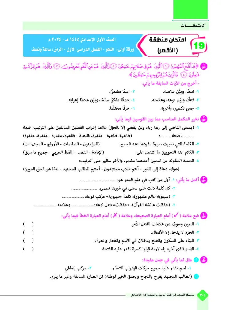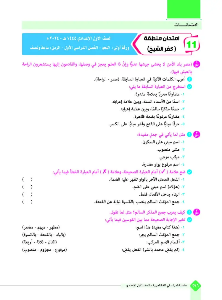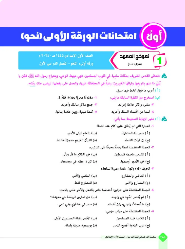 امتحانات المرشد لغة عربية للصف الأول الإعدادي الأزهري الترم الأول 2026 بالإجابات