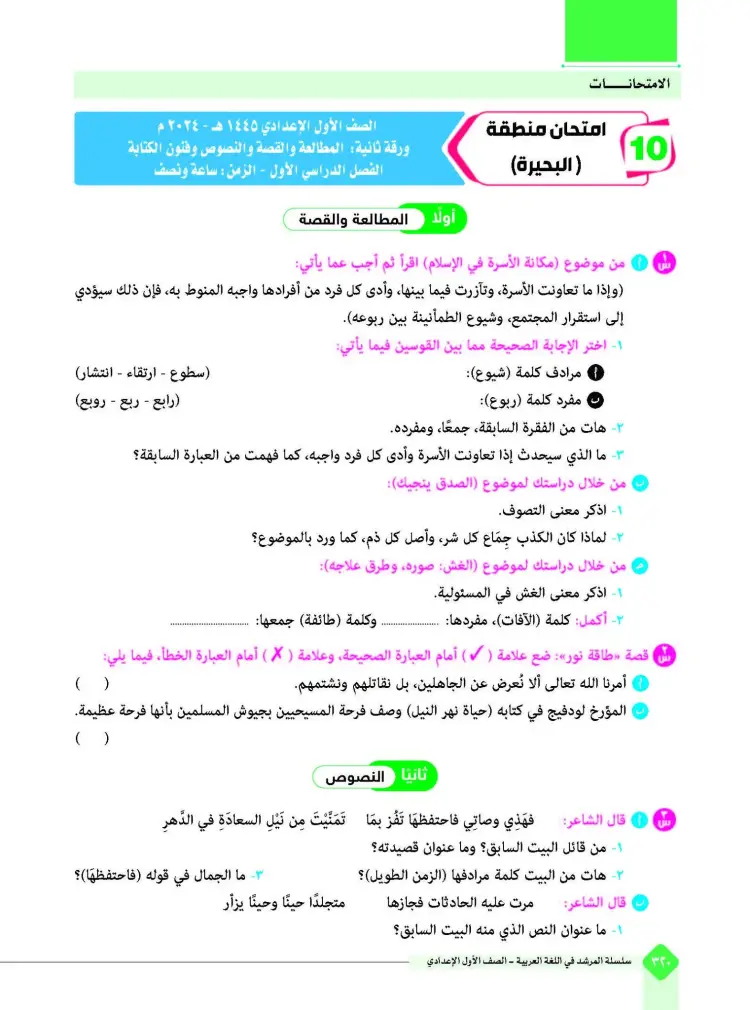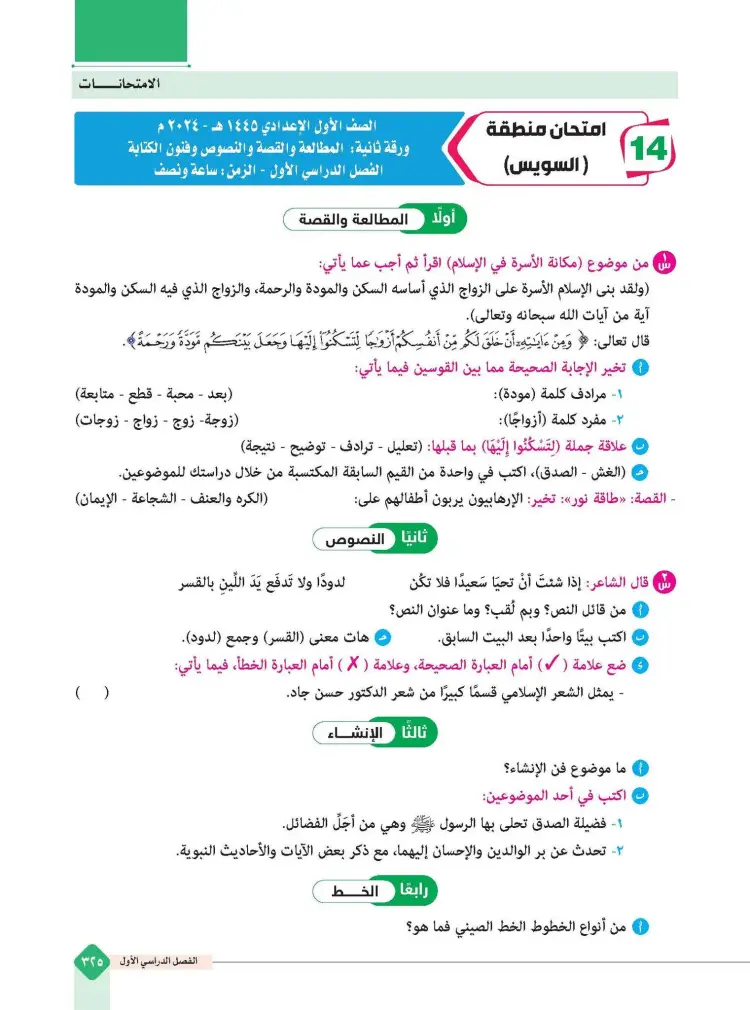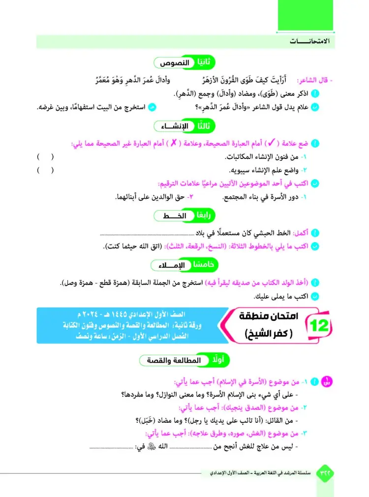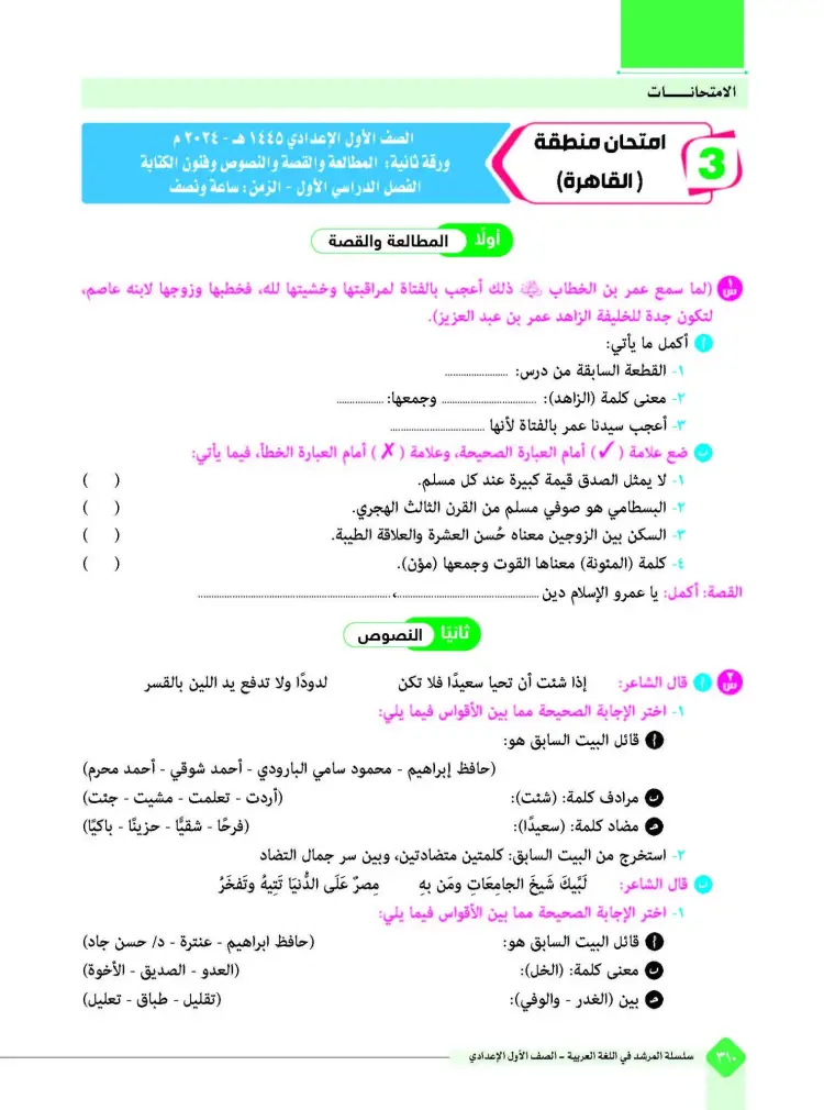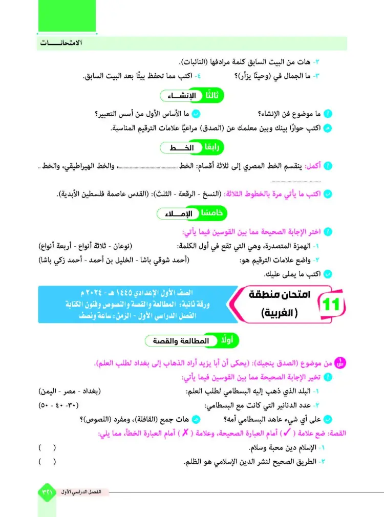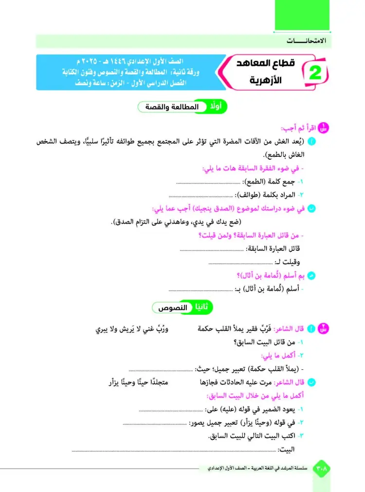 امتحانات عربي أولى إعدادي أزهر ترم أول 2025 2026