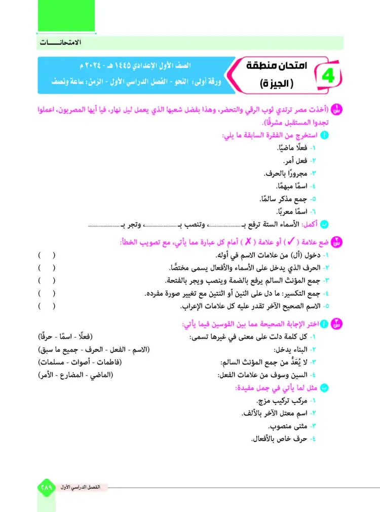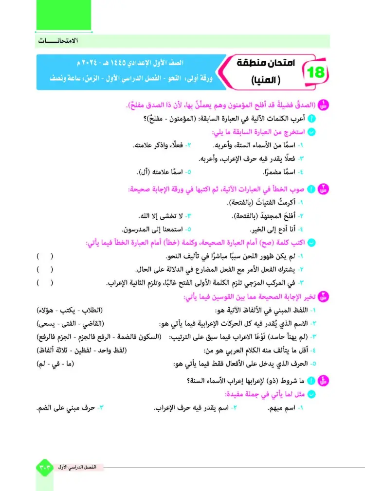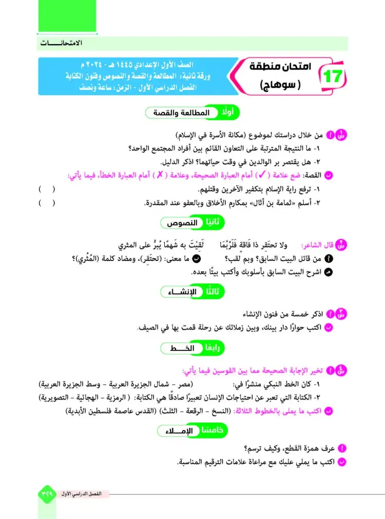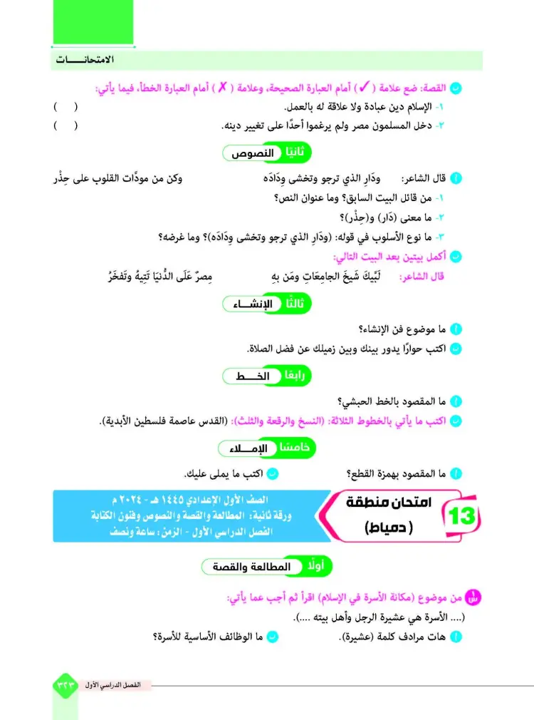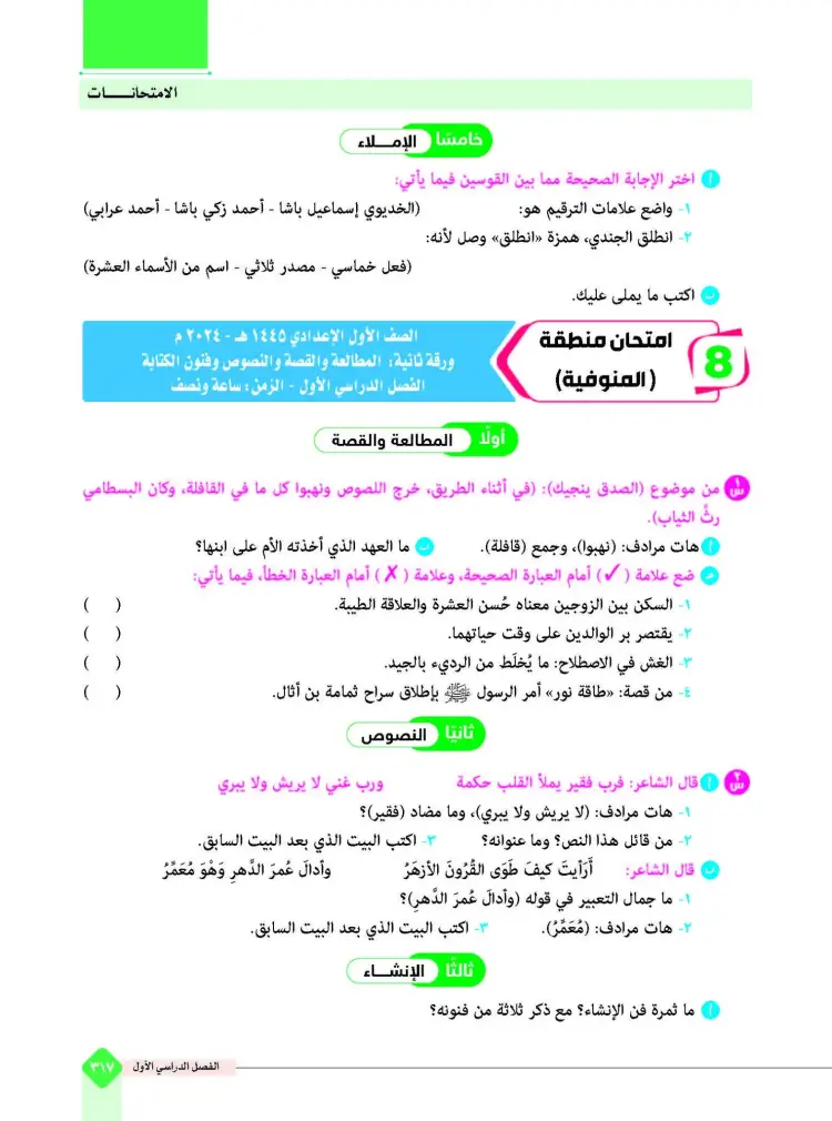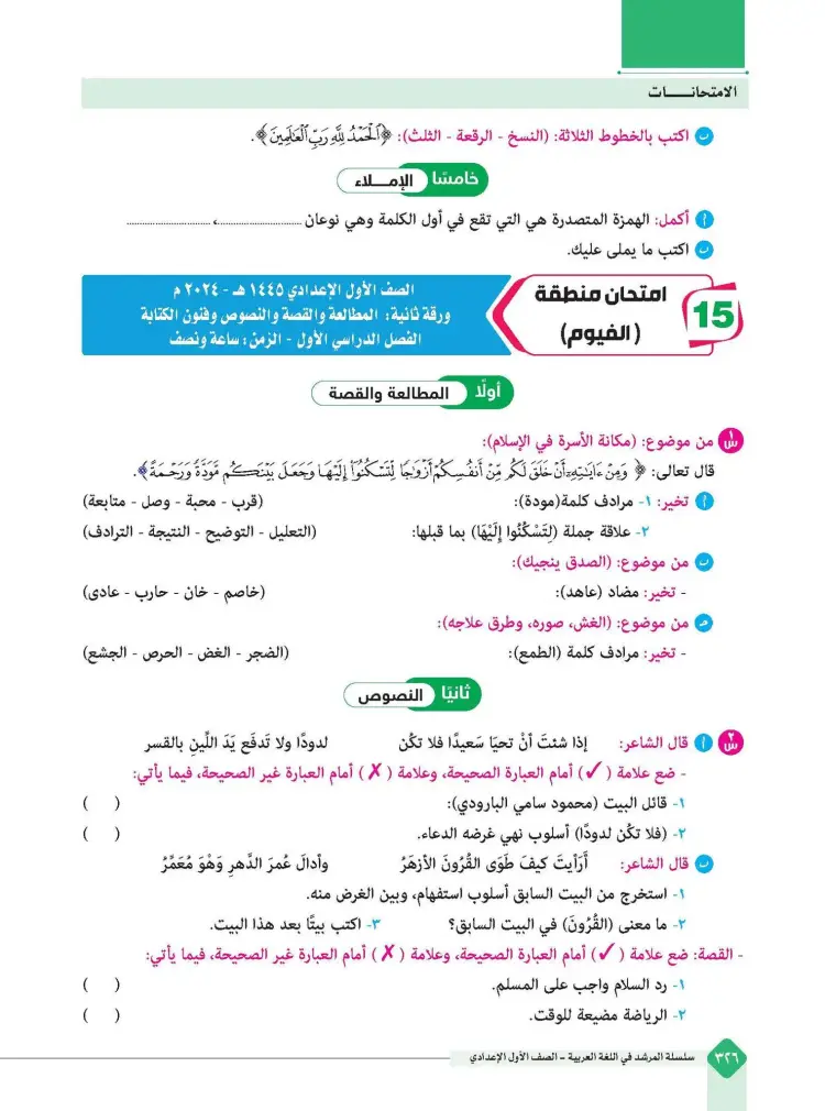 امتحانات عربي أولى إعدادي أزهر ترم أول 2025 2026