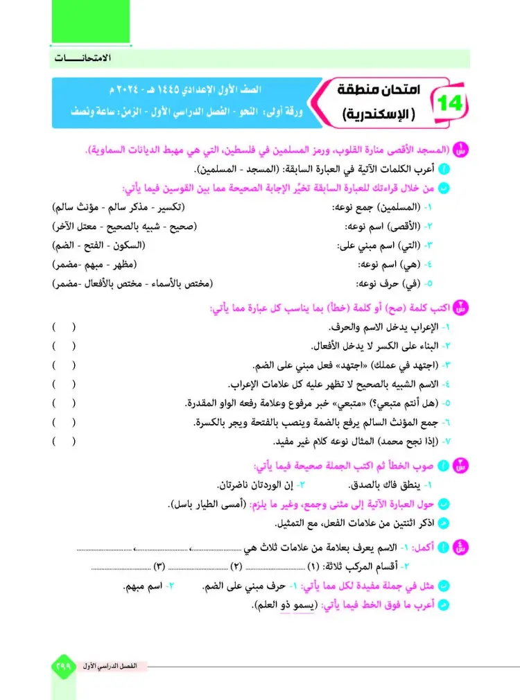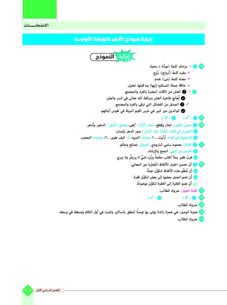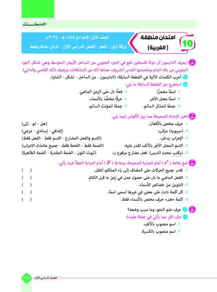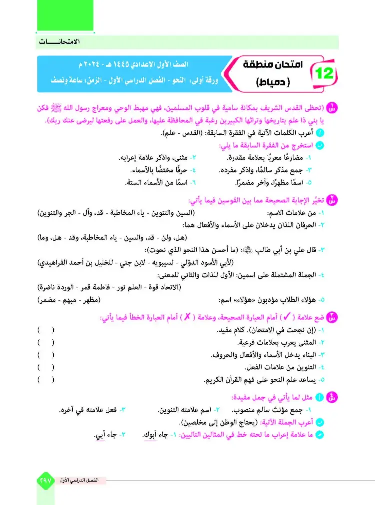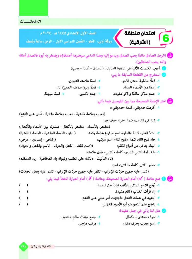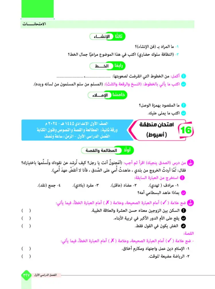 امتحانات عربي أولى إعدادي أزهر ترم أول 2025 2026