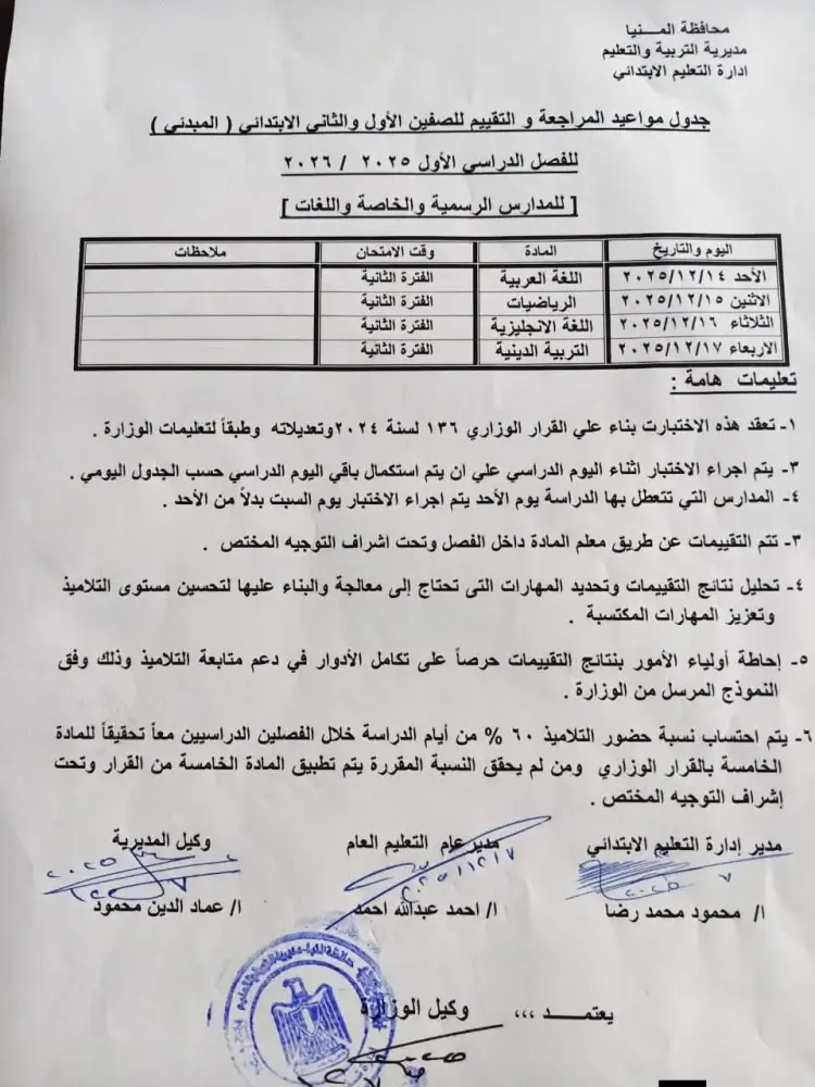 أعلنت مديرية التربية والتعليم بمحافظة المنيا، ممثلة في إدارة التعليم الابتدائي، مواعيد جدول المراجعة والتقييم المبدئي للصفين الأول والثاني الابتدائي للمدارس الرسمية والخاصة واللغات، وذلك للفصل الدراسي الأول بالعام 2025 2026.