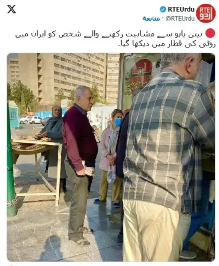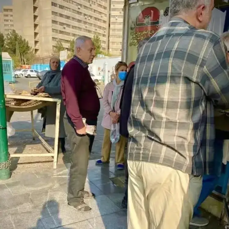 أثارت صورة تداولها نشطاء عبر مواقع التواصل الاجتماعي ضجة واسعة خلال الساعات الماضية، حيث ظهر فيها رجل يحمل شبها كبيرا لرئيس الوزراء الإسرائيلي بنيامين نتنياهو، وهو يقف في طابور لشراء الخبز أمام أحد المخابز في حي إكباتان بالعاصمة الإيرانية طهران.