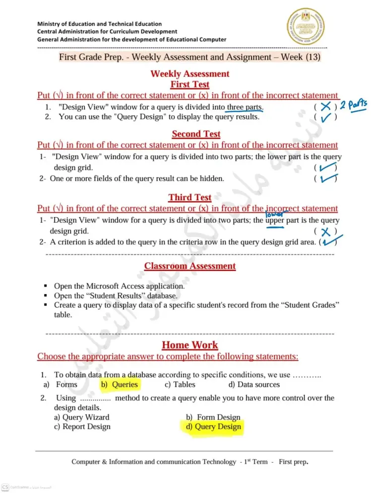 للإطلاع على باقي أسئلة وحل الأداء الصفي وواجب وتقييم الأسبوع الثالث عشر ict للصف الأول الإعدادي ترم أول 2026 يمكن للطلاب تحميل والإطلاع على الصورة التالية: