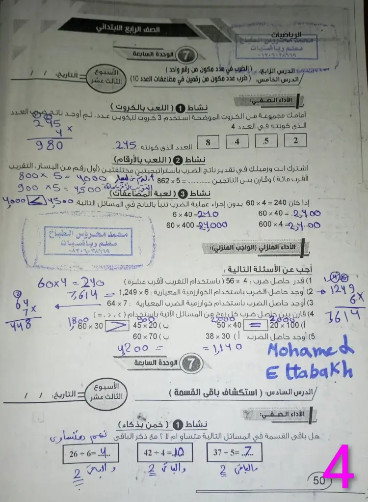 حل الأداء الصفي رياضيات رابعة ابتدائي الأسبوع الثالث عشر ترم أول 2026