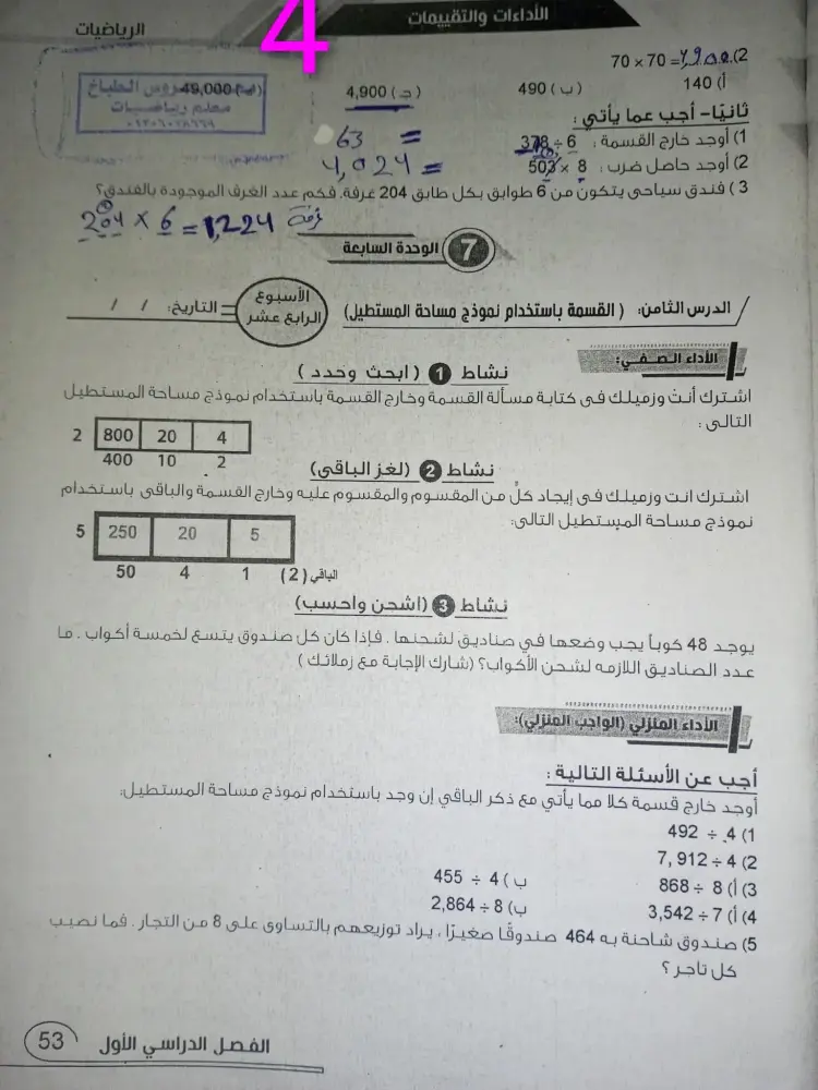 أوجد خارج قسمة كلا مما يأتي مع ذكر الباقي إن وجد باستخدام نموذج مساحة المستطيل: 4 ÷ 492