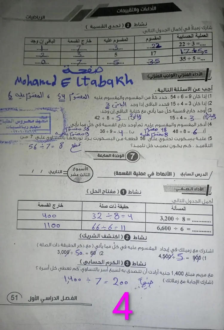 هل باقي القسمة في المسائل التالية متساوٍ أم لا مع ذكر الباقي (نشاط خمن بذكاء):