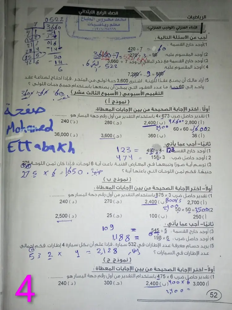 يشمل حل الواجب المنزلي رياضيات رابعة ابتدائي الأسبوع الثالث عشر ترم أول 2026 على مجموعة من الأسئلة والإجابات، والتي منها الآتي: