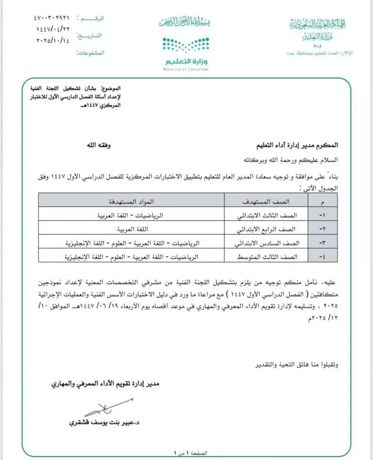 جاء في التعميم أن مدير إدارة تعليم جدة وافق على توجيه المدير العام للتعليم بتطبيق الاختبارات المركزية للفصل الدراسي الأول 1447هـ، وطُلب من المشرفين والمختصين تشكيل لجان فنية للإعداد.