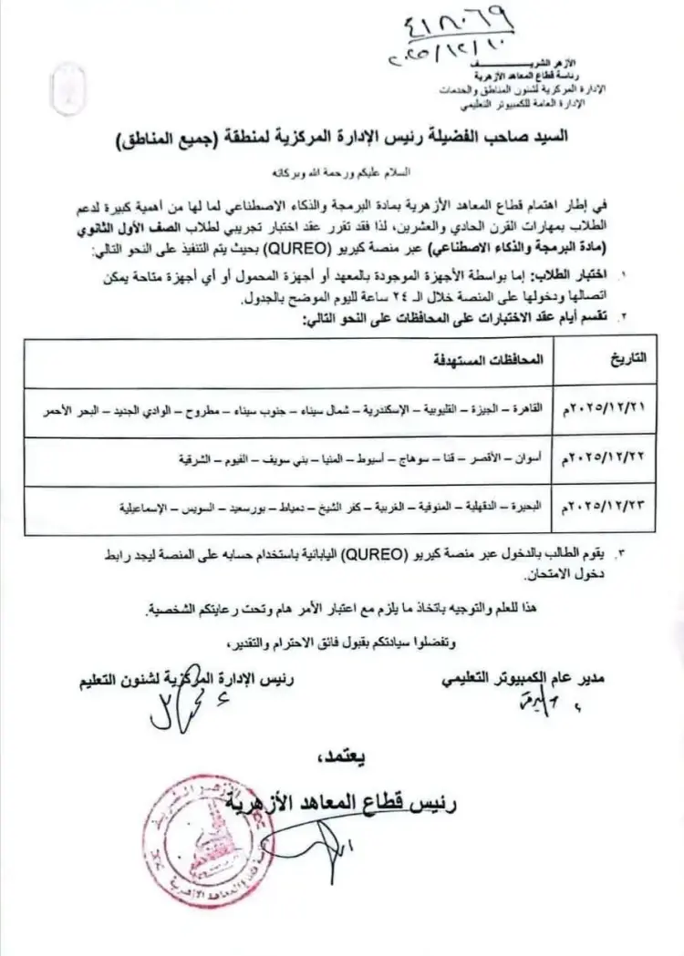 حيث تقرر عقد اختبار تجريبي لطلاب الصف الأول الثانوي لمادة البرمجة والذكاء الاصطناعي (QUREO) بالترم الأول 2026، وفقا لما بيّن قطاع المعاهد الأزهرية.
