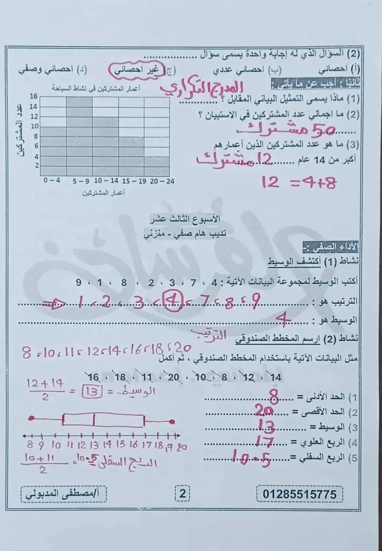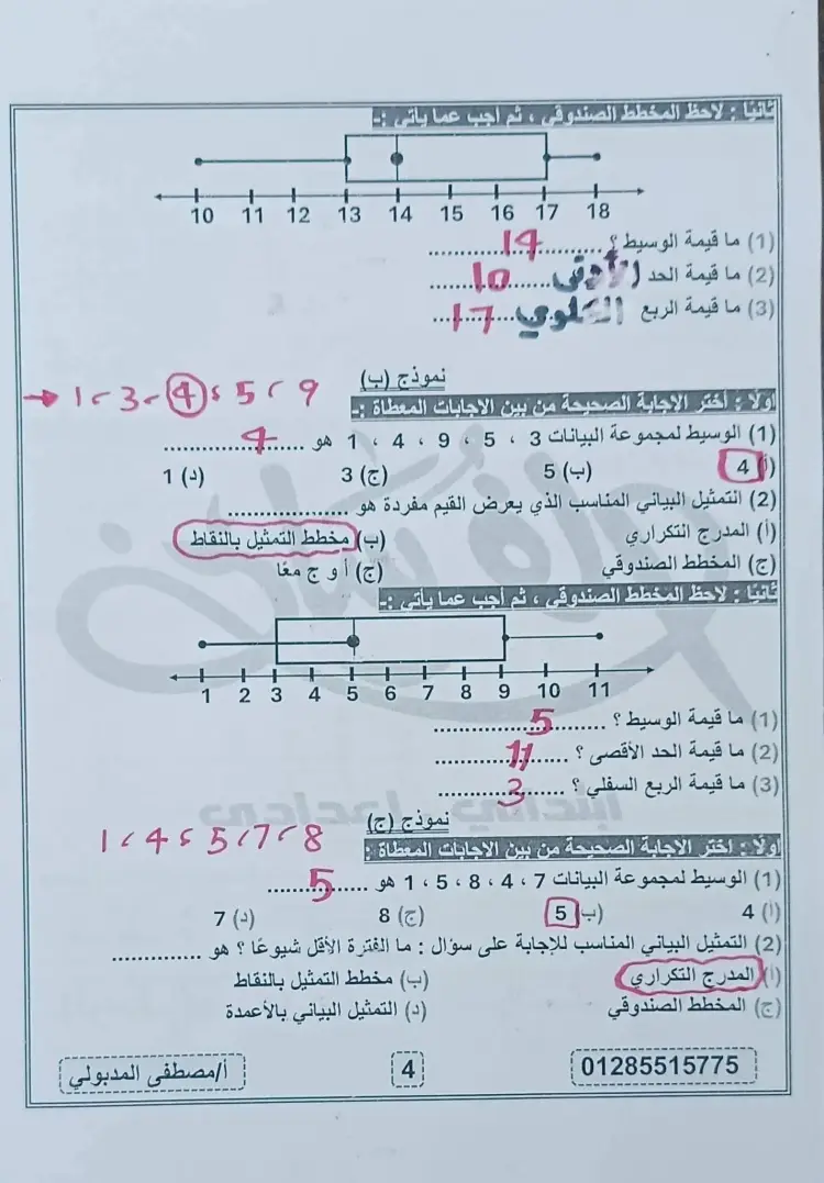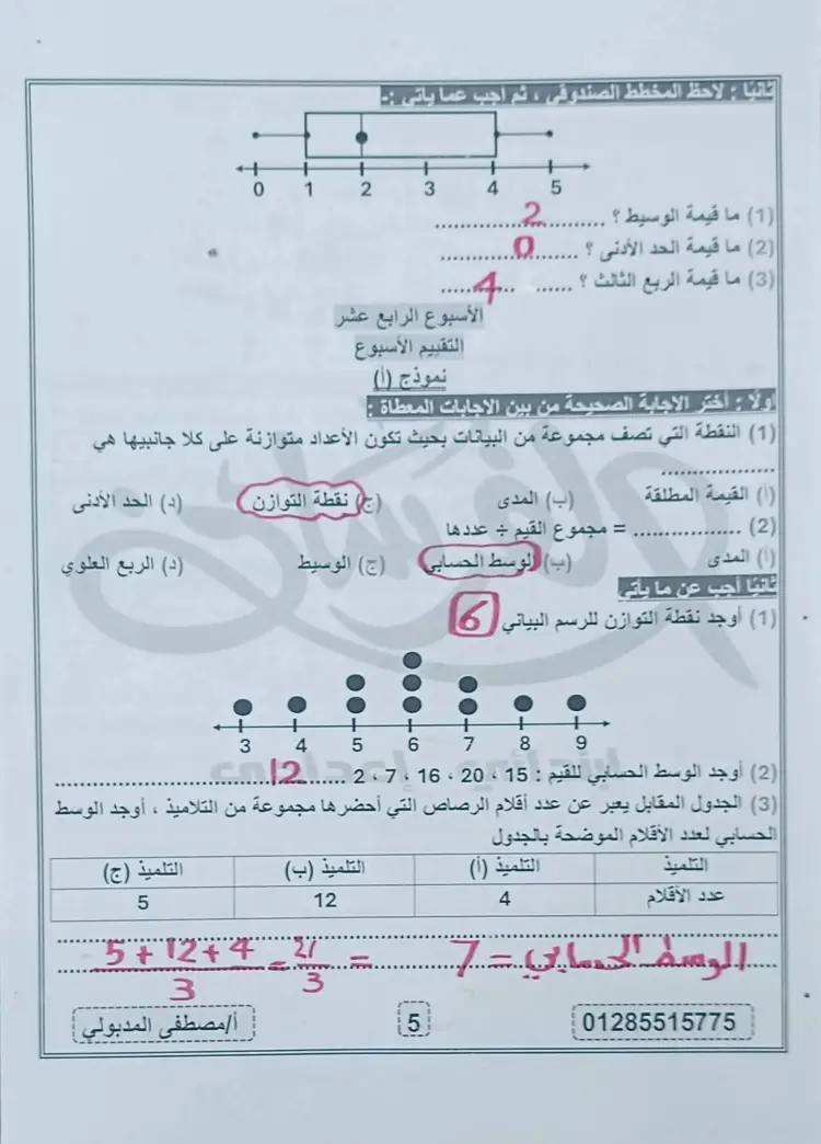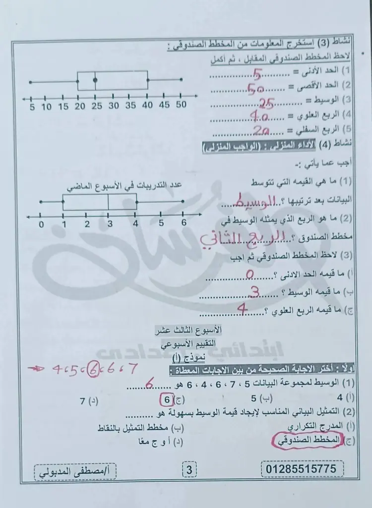السؤال: في المخطط الصندوقي الأول الملاحظ في التقييم الأسبوعي (نموذج ب)، ما قيمة الربع العلوي؟ الإجابة: 17.