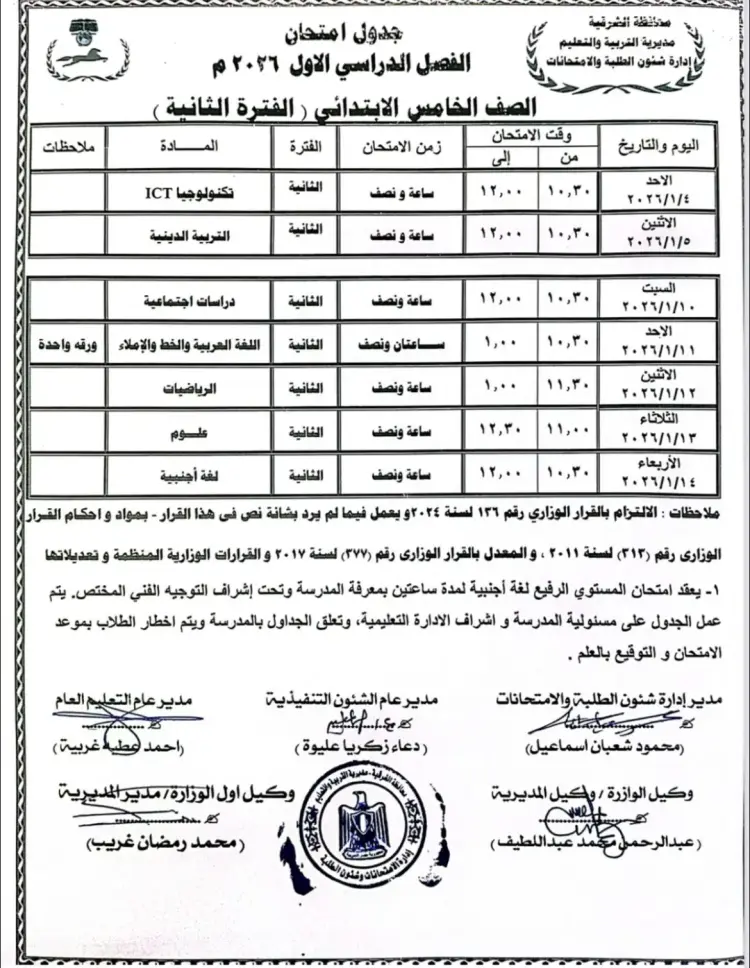 جدول امتحانات خامسة ابتدائي الترم الأول 2026 الشرقية