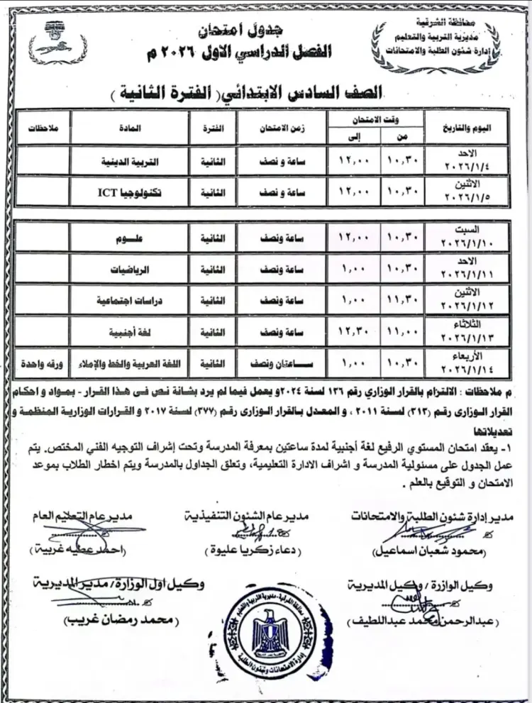 جدول امتحانات الصف السادس الابتدائي الترم الأول 2026 الشرقية