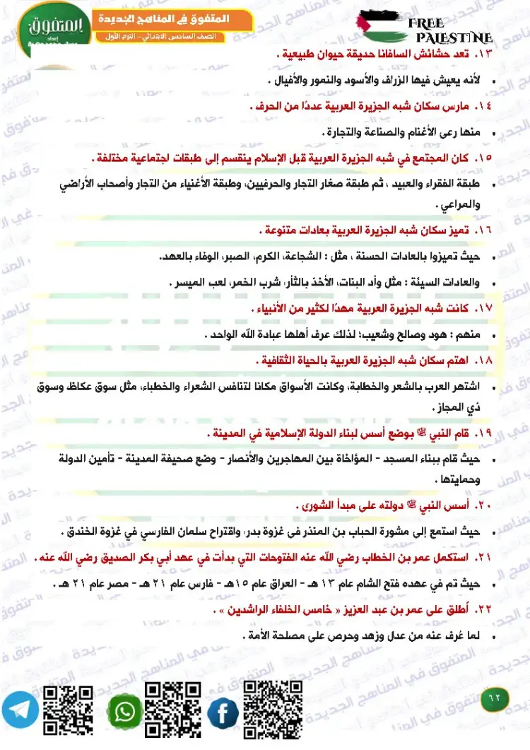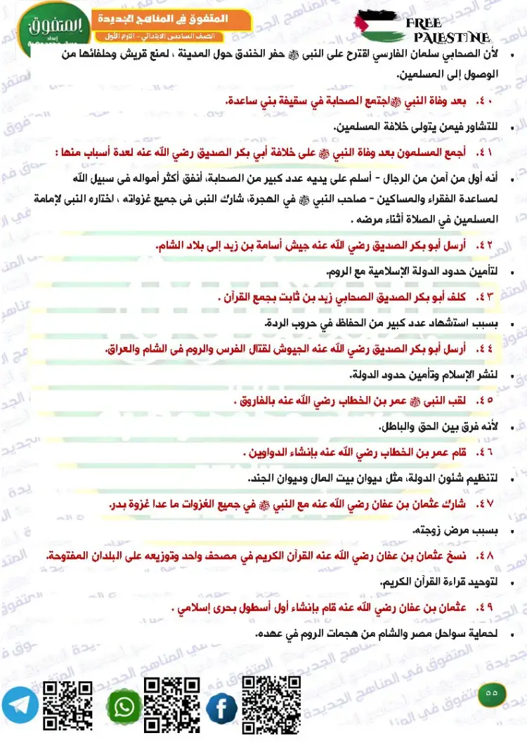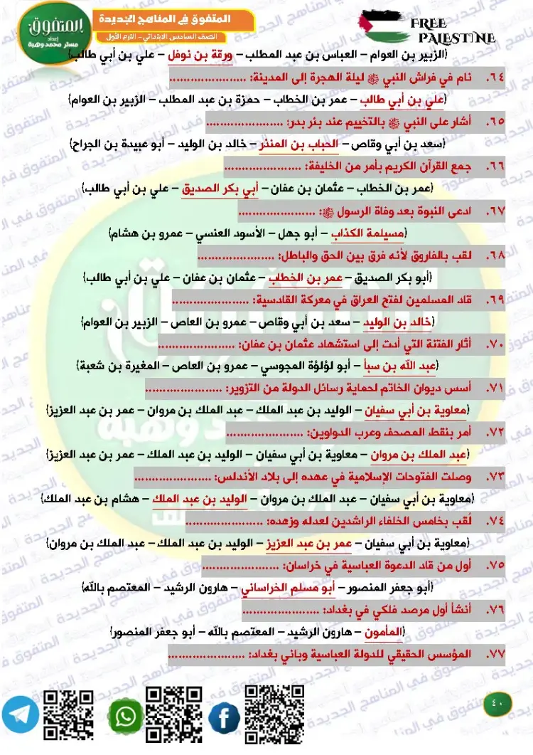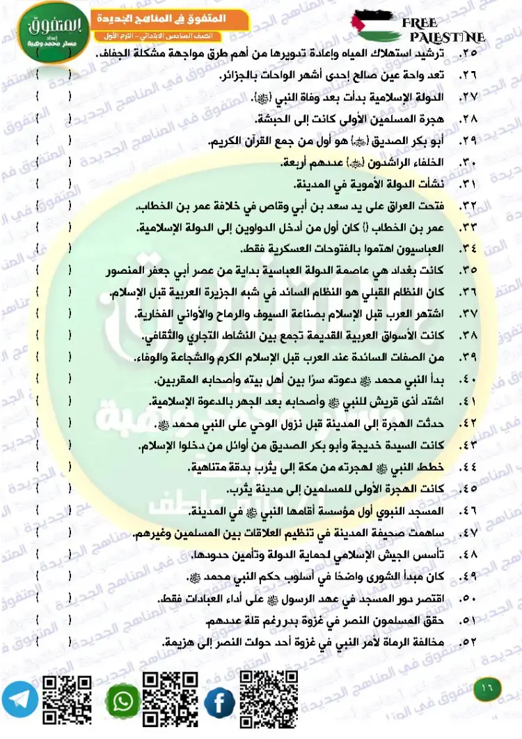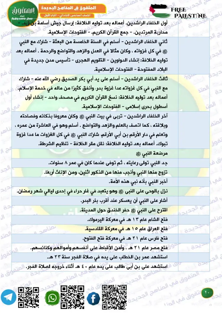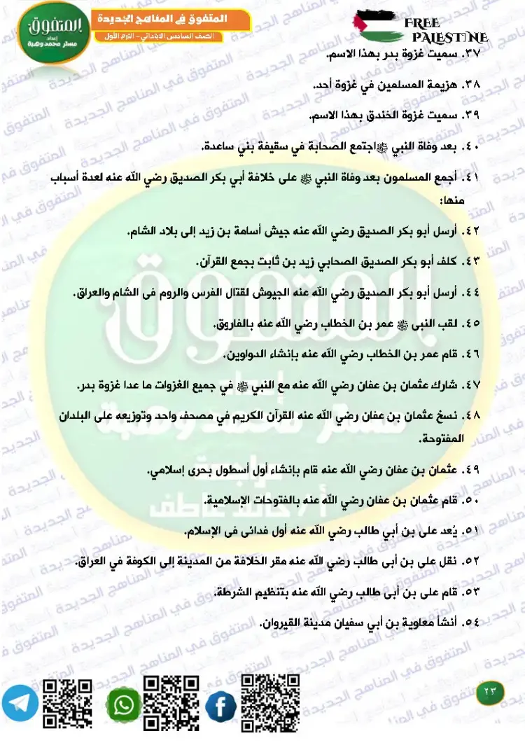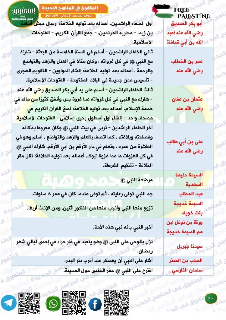 التاريخ الإسلامي والخلفاء الراشدين: يتناول سيرة النبي محمد صلى الله عليه وسلم (ولادته، الهجرة، الغزوات)، أعمال الخلفاء الراشدين الأربعة (أبو بكر، عمر، عثمان، علي)، وأحداث الفتوحات الإسلامية الكبرى [5، 6، 10، 19، 27، 30، 35].