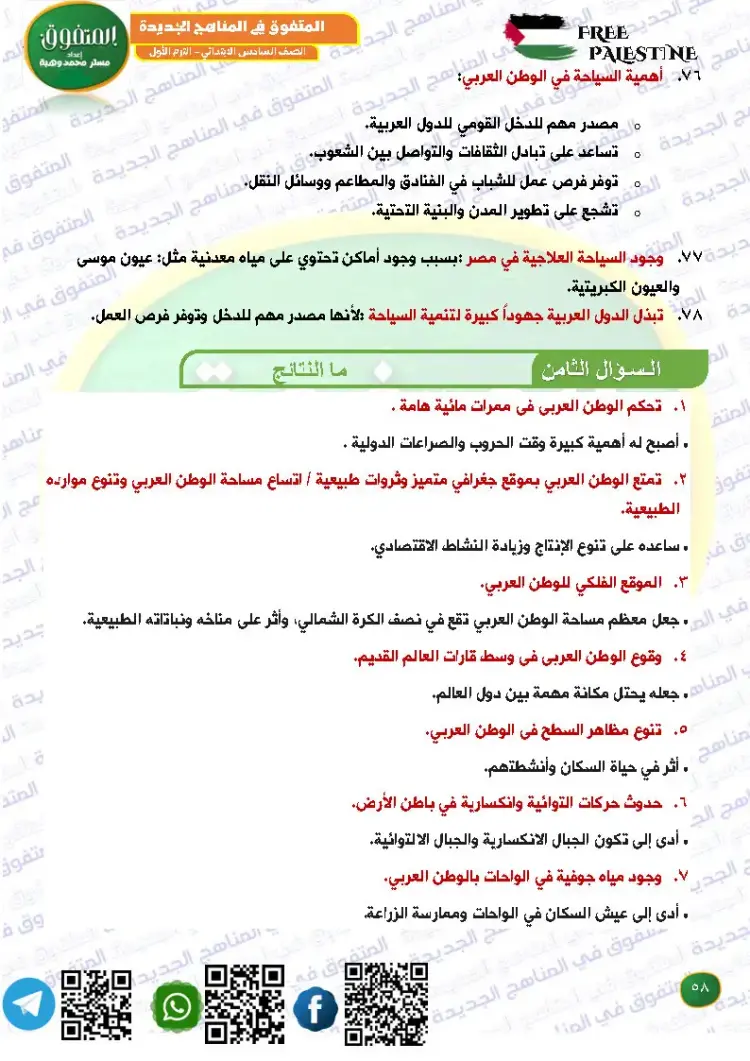 سؤال: «بم تفسر: «الأهمية الاقتصادية لموقع الوطن العربي: ...............»» الإجابة الصحيحة: «يتحكم في ممرات مائية هامة مثل قناة السويس - مضيق هرمز - مضيق باب المندب - مضيق جبل طارق، وهذا جعله ذا أهمية كبيرة وقت الحروب والصراعات الدولية.».