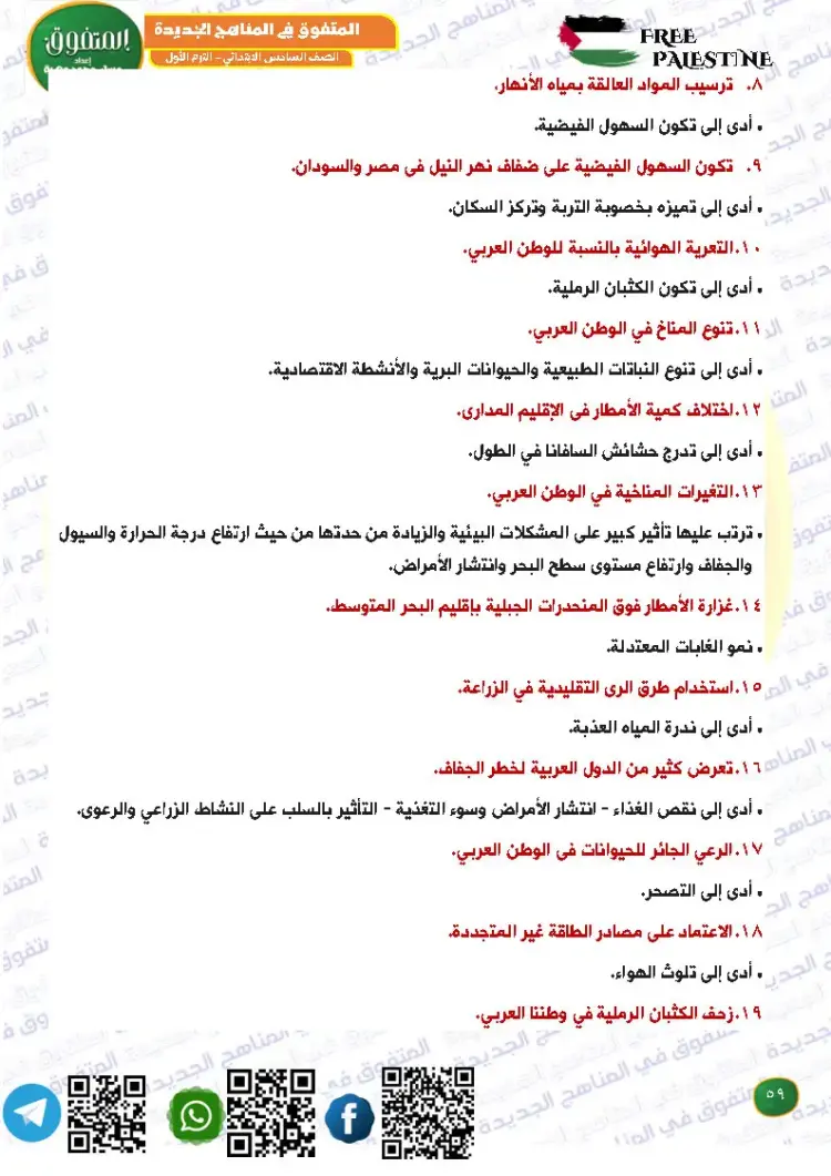 مشكلات البيئة والموارد: تتناول قضايا التصحر، الجفاف، السيول، ندرة المياه العذبة، وتلوث الهواء، بالإضافة إلى جهود الدول العربية لمواجهة هذه المشكلات [18، 26، 28].
