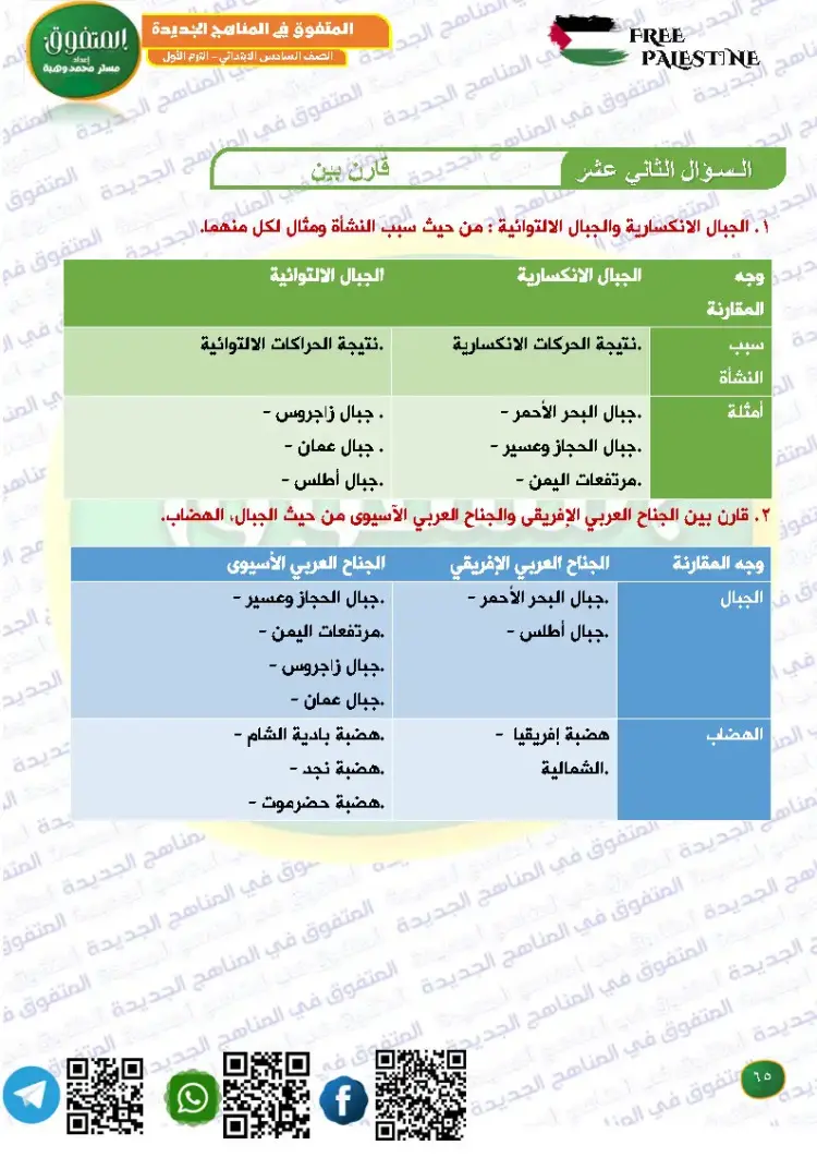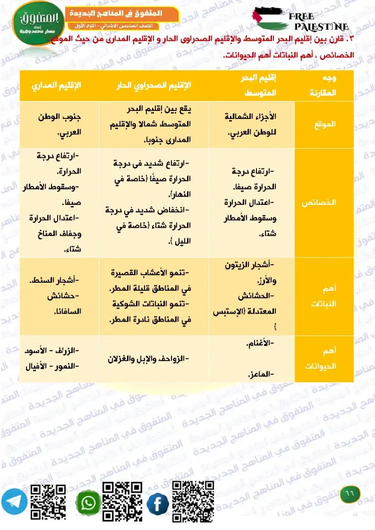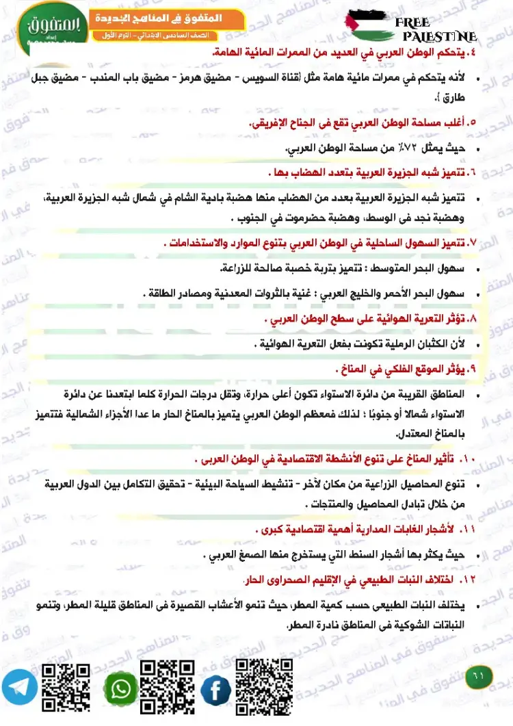 الجغرافيا الطبيعية للوطن العربي: تشمل دراسة الموقع الفلكي والجغرافي، التضاريس (الجبال، الهضاب، السهول)، الأقاليم المناخية المختلفة وأنواع النباتات [9، 13، 14، 15، 25].
