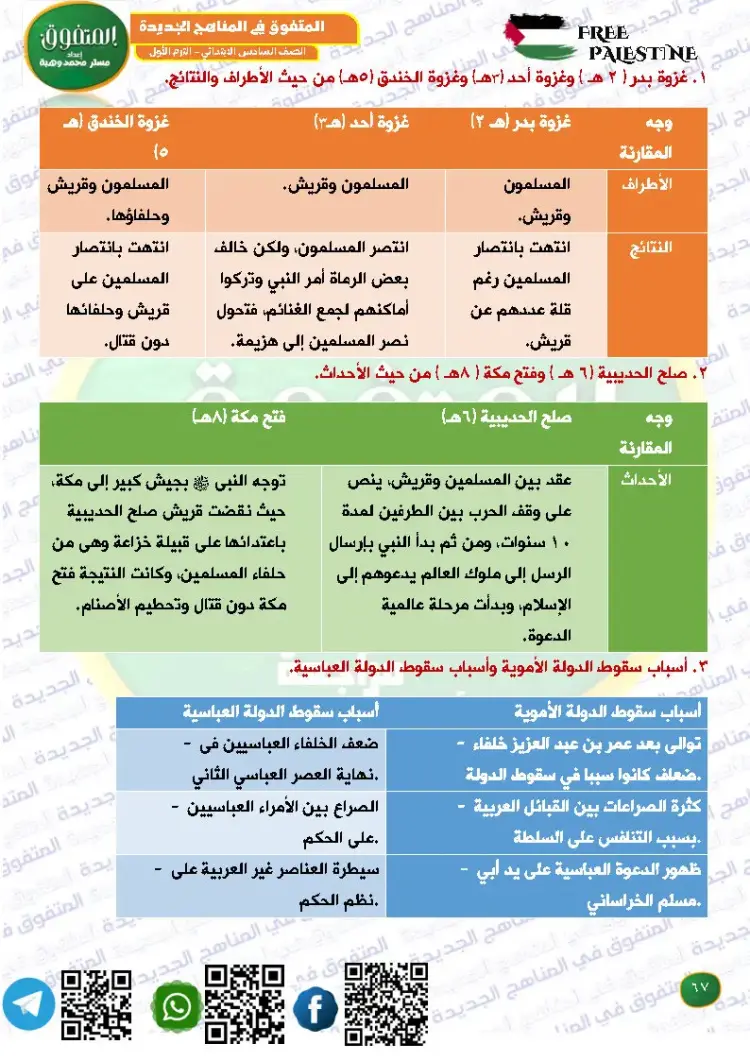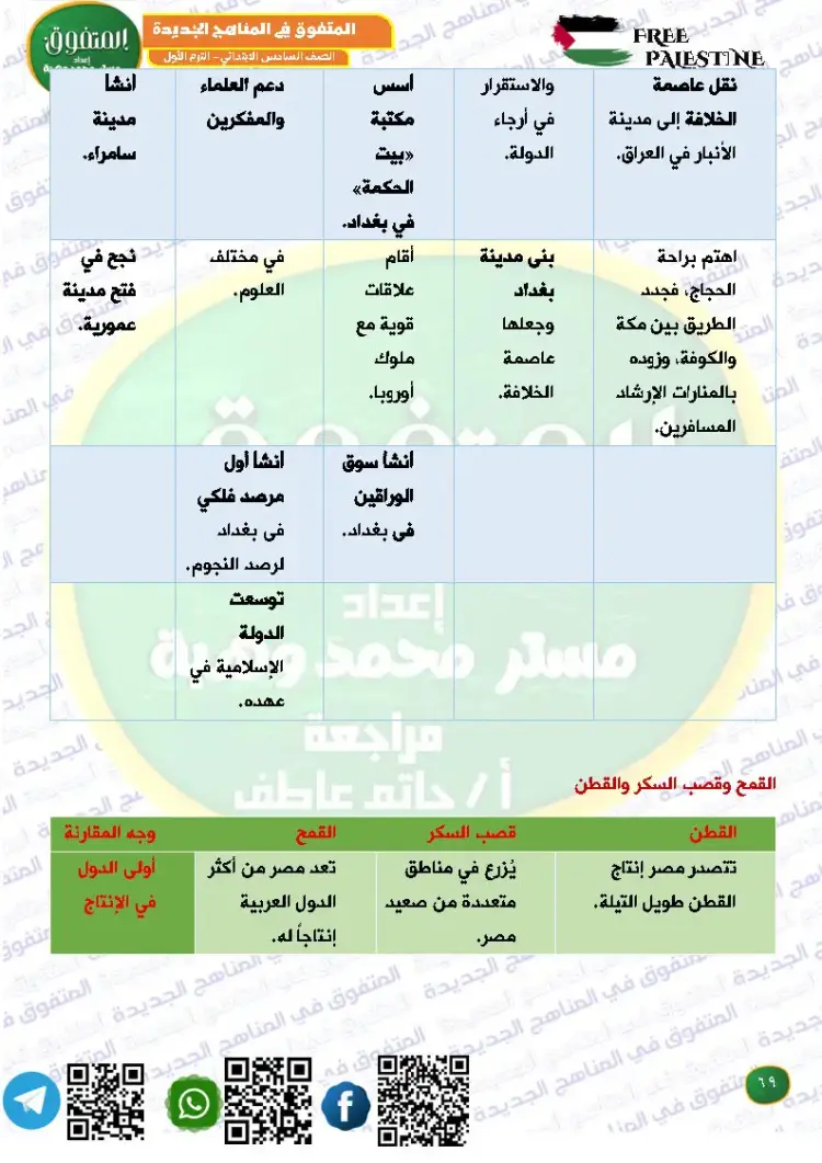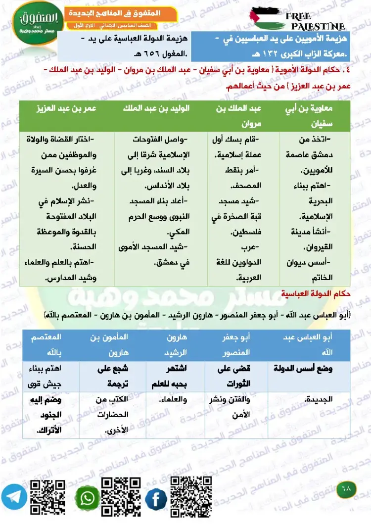 الدول والمدن الإسلامية: يغطي تأسيس ونشأة الدولتين الأموية والعباسية، أشهر حكامها (مثل معاوية بن أبي سفيان، عبد الملك بن مروان، هارون الرشيد، المعتصم)، وإنشاء المدن والدواوين [5، 10، 17، 39].