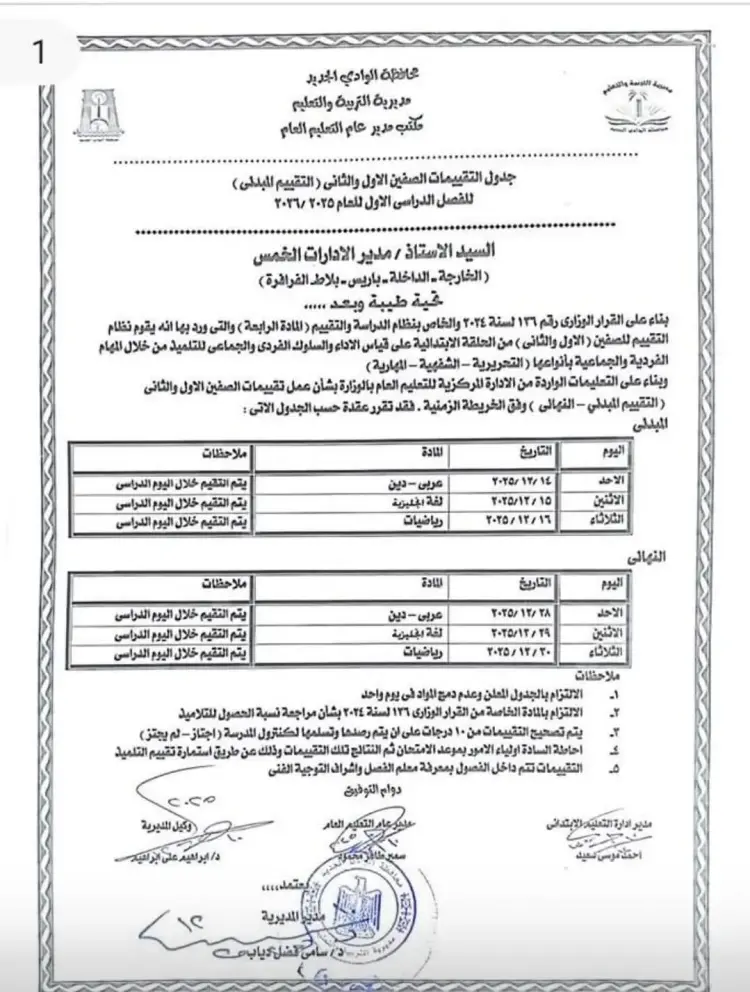جدول التقييمات المبدئية بالوادي الجديد ترم أول 2026