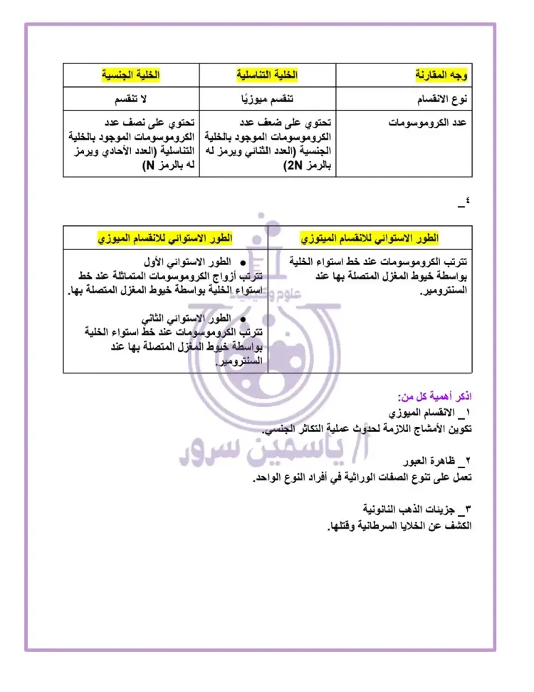 الإجابة: الانقسام الميتوزي ينتج خليتين جسديتين متماثلتين,، بينما الانقسام الميوزي ينتج أربع خلايا جنسية (أمشاج).