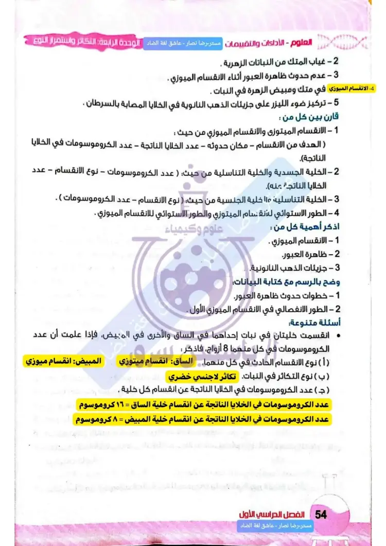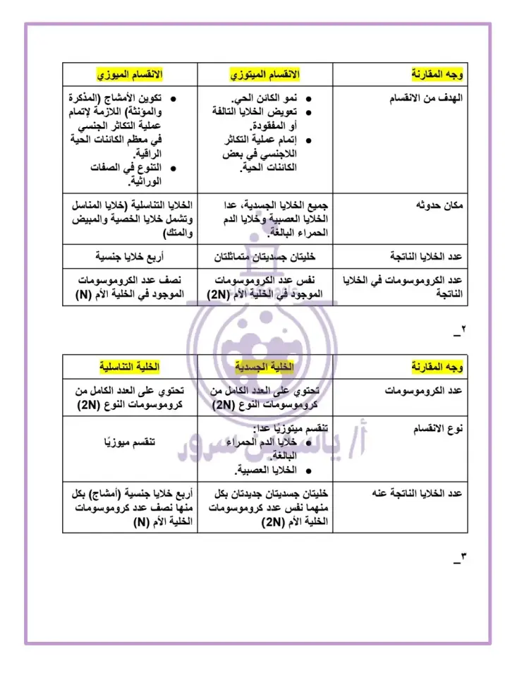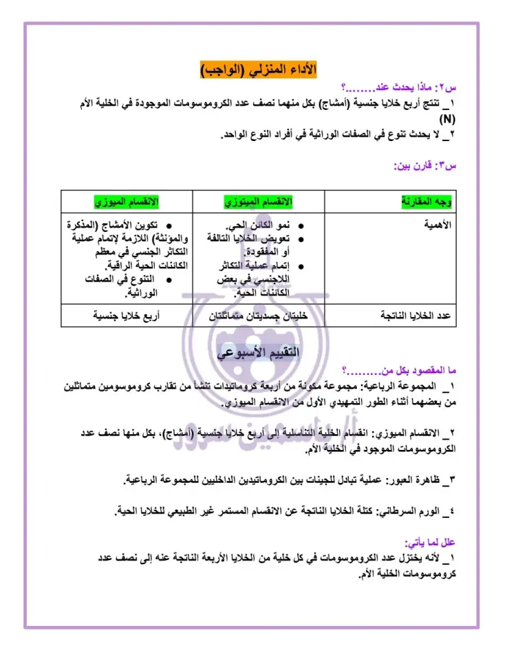 س 3: قارن بين الانقسام الميتوزي والانقسام الميوزي من حيث عدد الخلايا الناتجة.