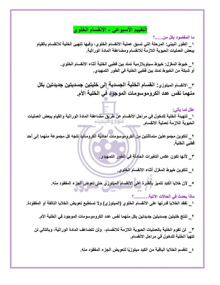 الإجابة: هو انقسام الخلية الجسدية إلى خليتين جديدتين بكل منهما نفس عدد الكروموسومات الموجود في الخلية الأم.