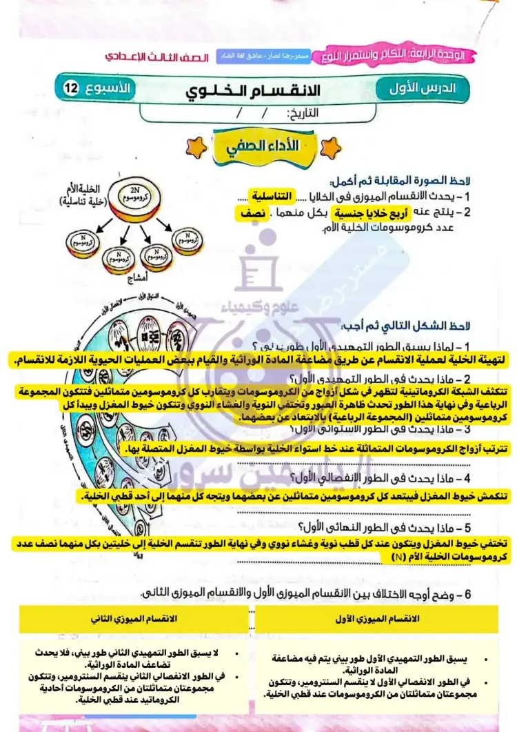 حل الأداء الصفي وواجب وتقييم الأسبوع الثاني عشر علوم للصف الثالث الإعدادي ترم أول 2026