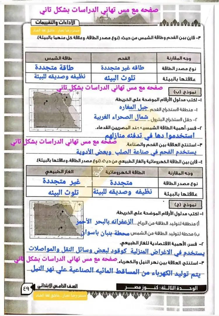 السؤال: اذكر اثنين من أماكن استخراج الغاز الطبيعي في مصر. الإجابة: يتم استخراجه في شمال الصحراء الغربية وشمال بورسعيد.