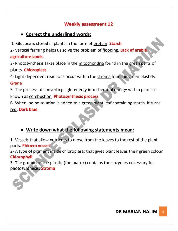 - Question (Correct the underlined words): Glucose is stored in plants in the form of protein. Answer: Starch.