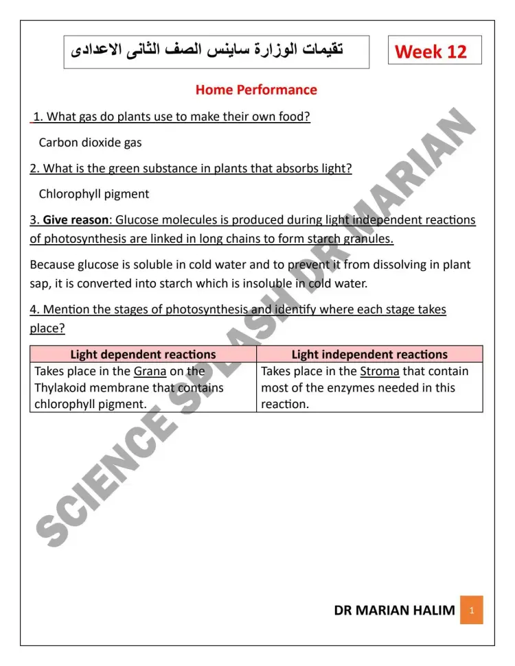 حل الأداء الصفي وواجب وتقييم الأسبوع الثاني عشر ساينس للصف الثاني الإعدادي ترم أول 2026