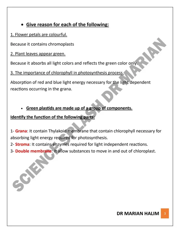 - Question (Give reason): Plant leaves appear green. Answer: Because it absorbs all light colors and reflects the green color only.