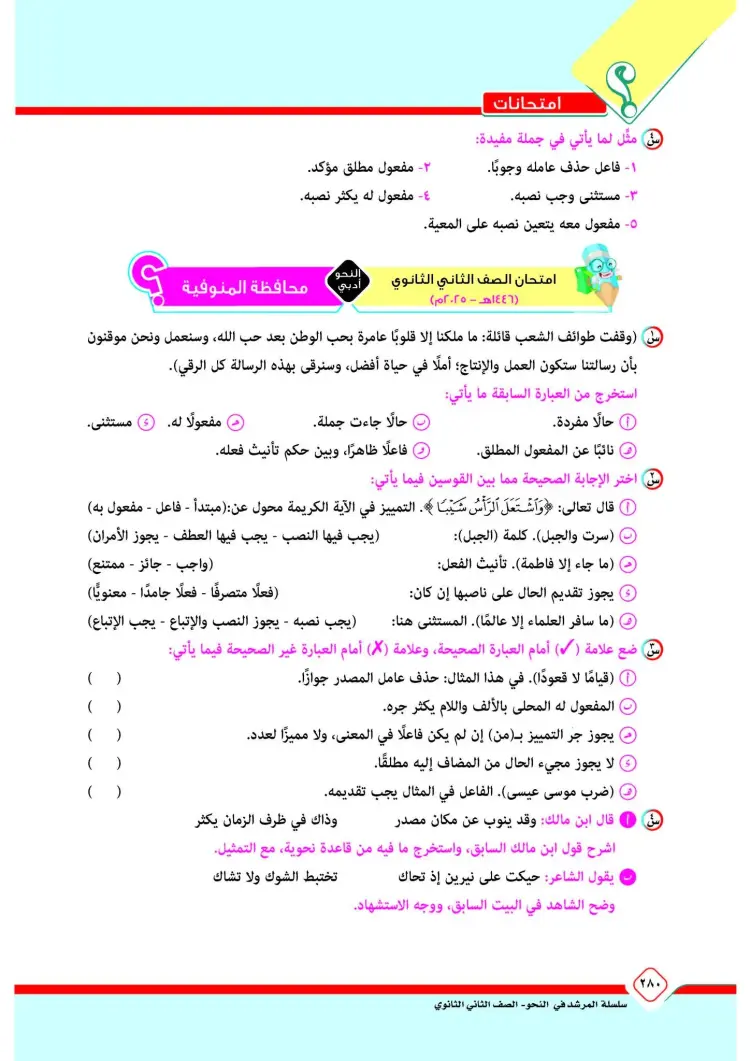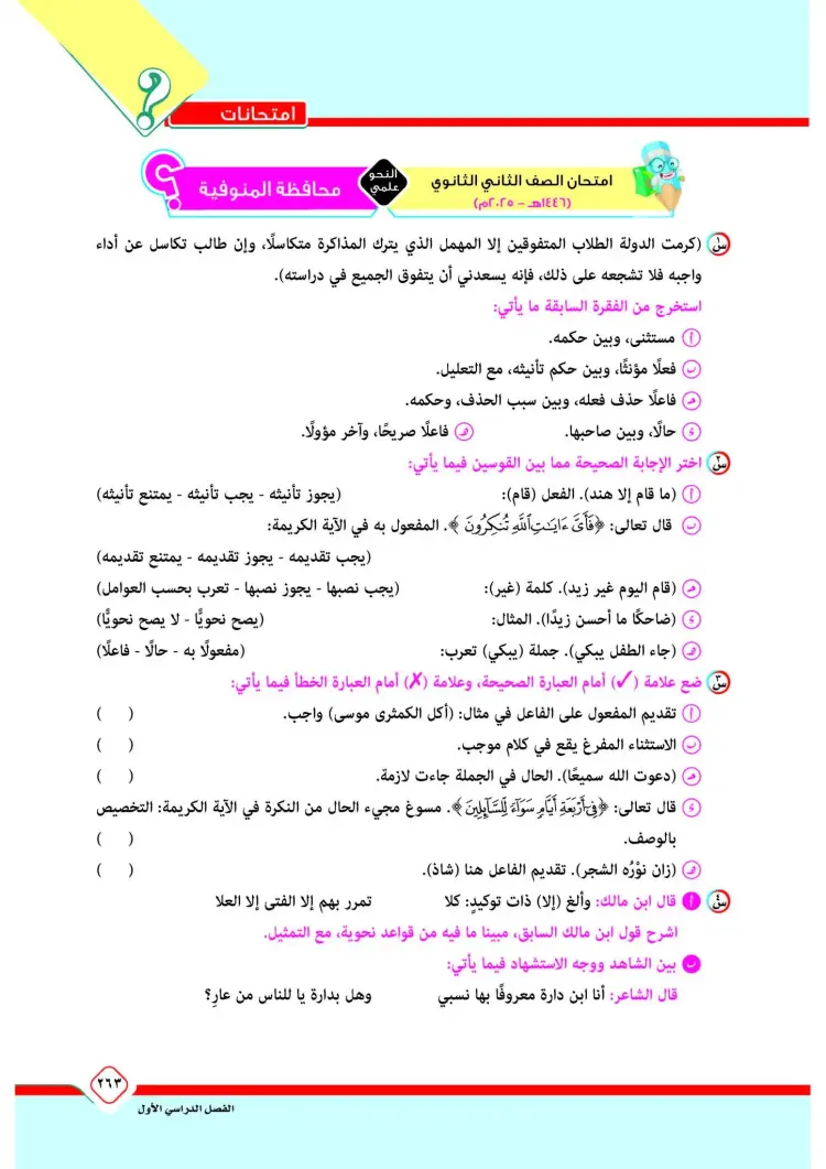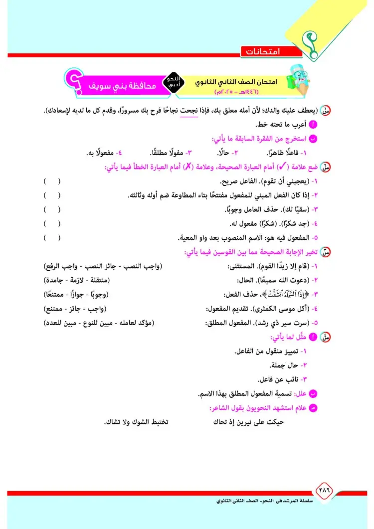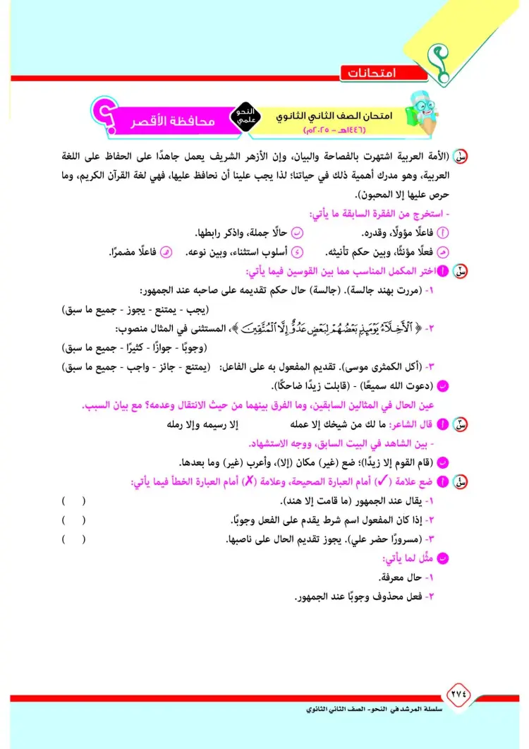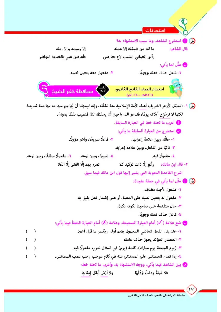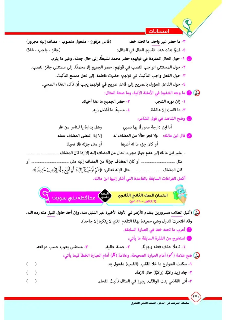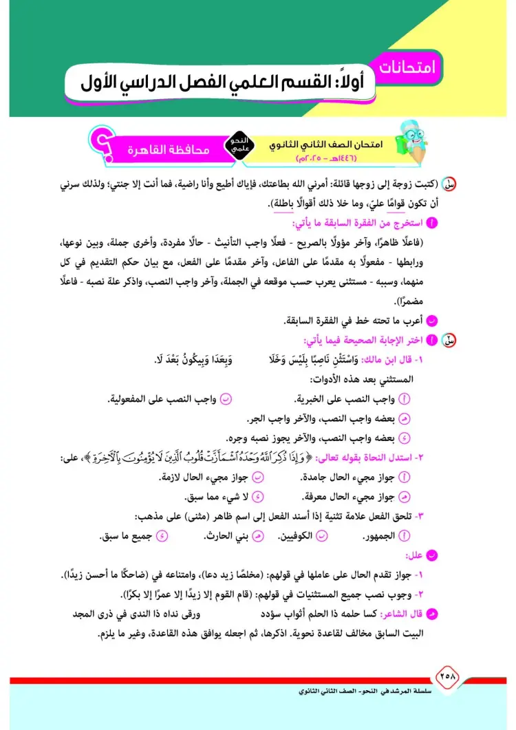 ينشر «شبابيك» امتحانات كتاب المرشد في مقرر النحو لطلاب الصف الثاني الثانوي الأزهري علمي وأدبي بالفصل الدراسي الأول للعام 2025 2026، حتى يتثنى للطلاب التدرب على حلها.