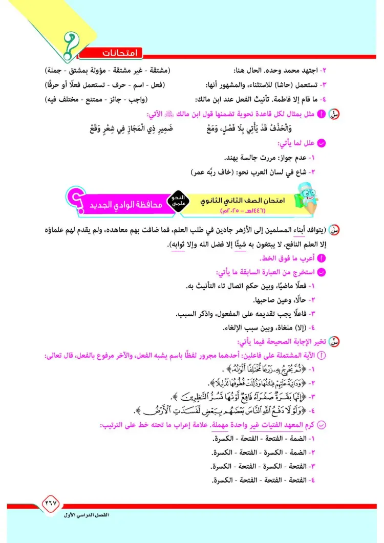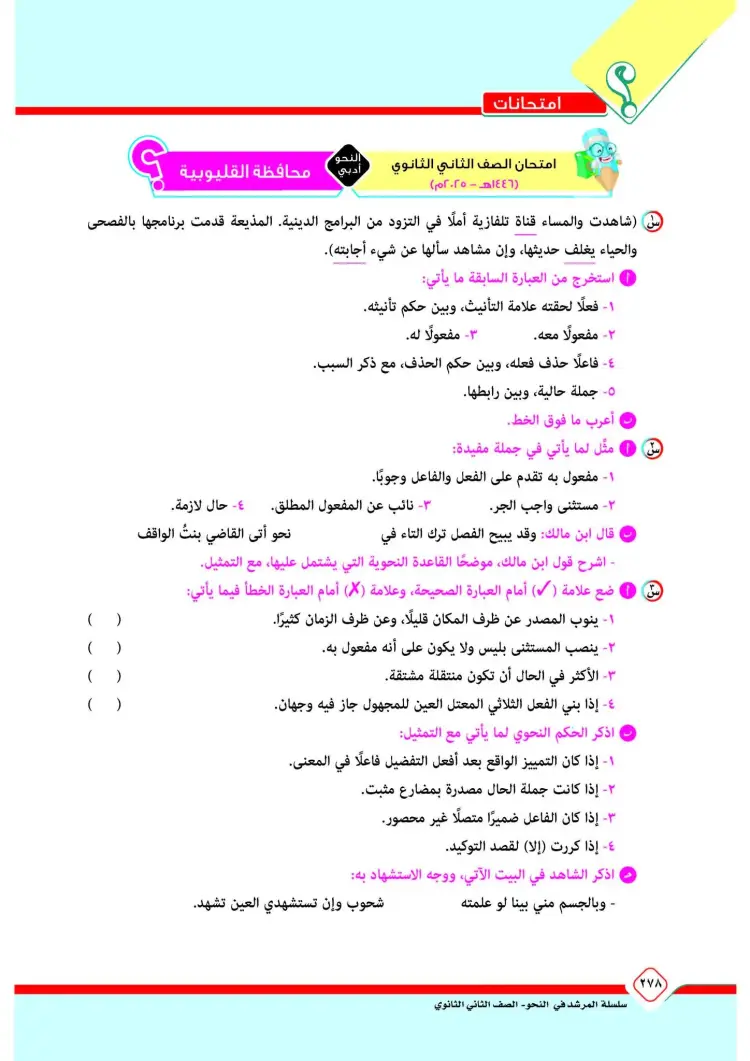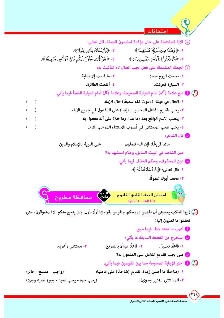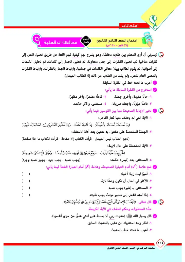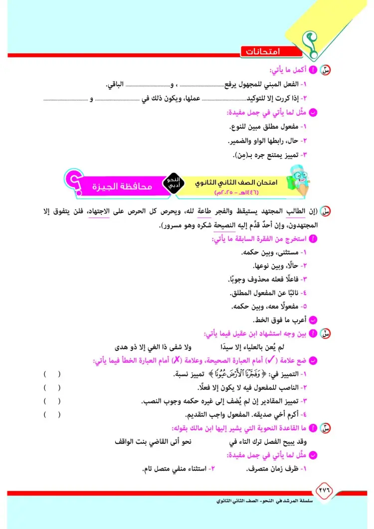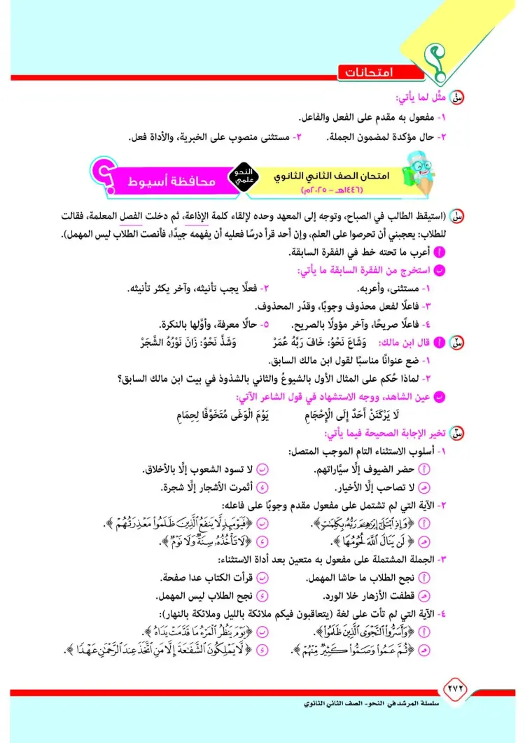 واشتمل كتاب المرشد على عدد من امتحانات المناطق الأزهرية للصف الثاني الثانوي بالشعبتين العلمية والأدبية في مقرر النحو، وبها العديد من نماذج الأسئلة المجاب عنها منها ما يلي: