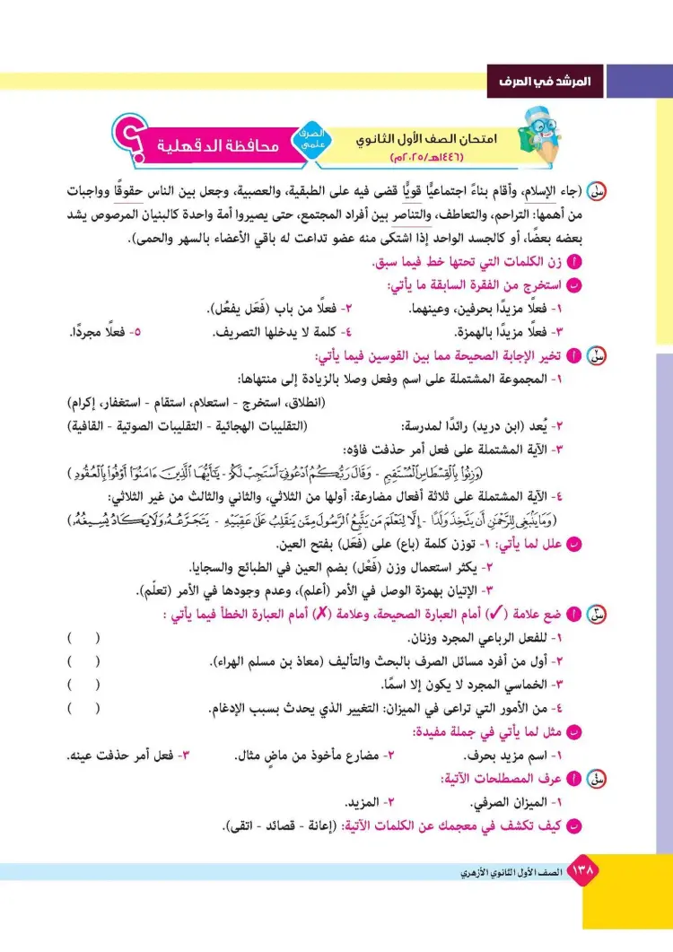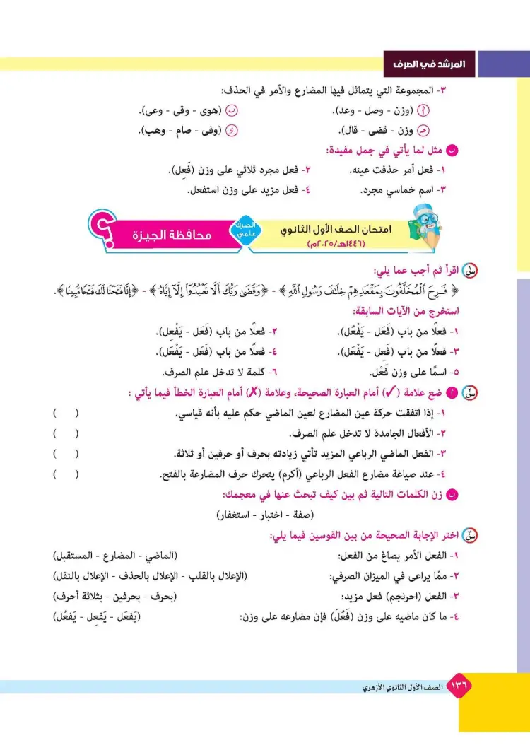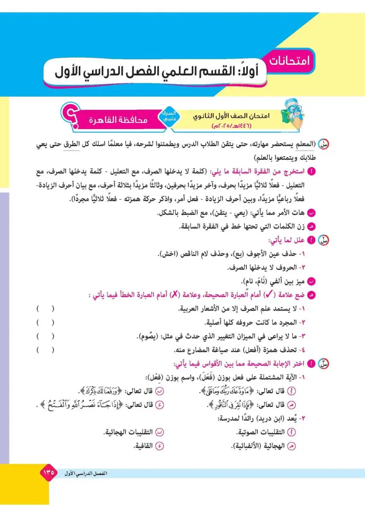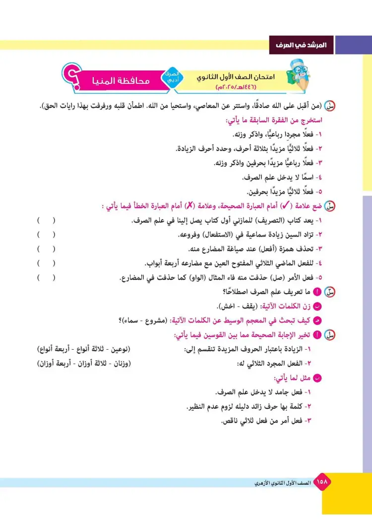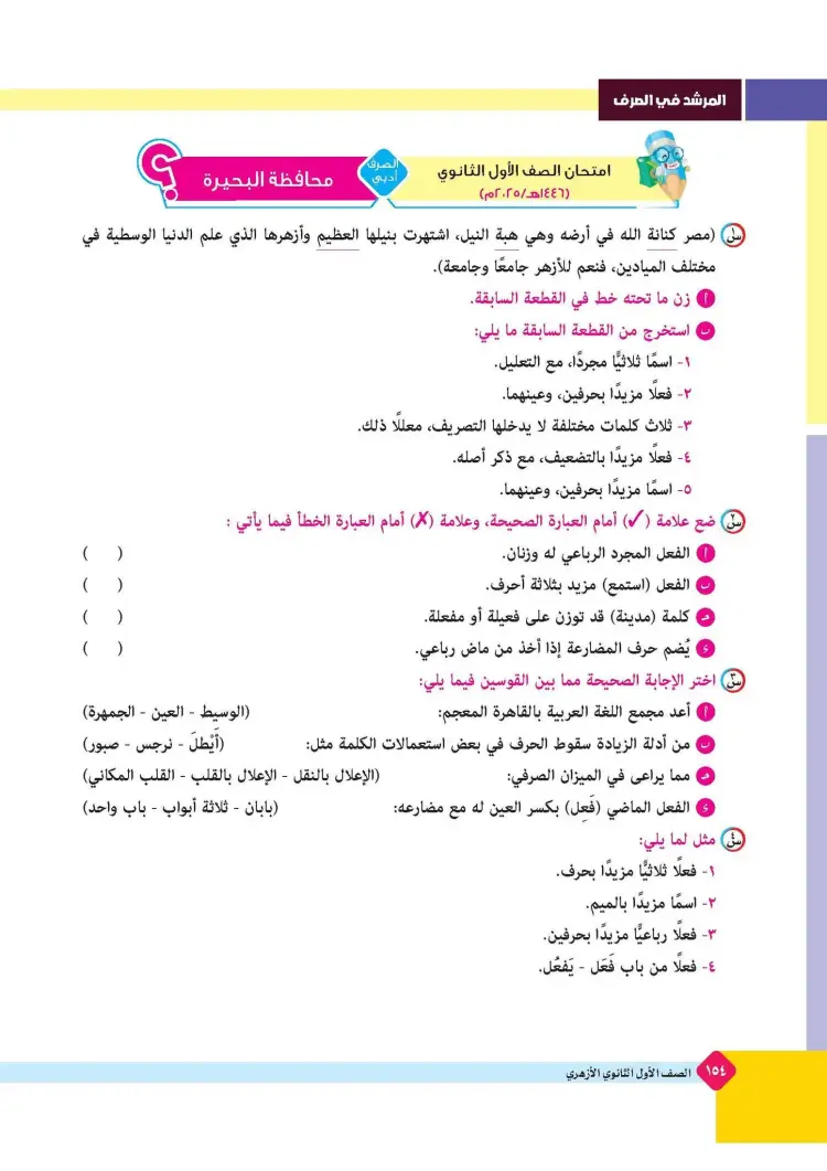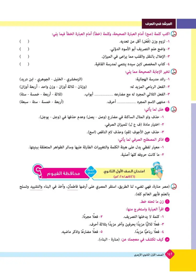 ينشر «شبابيك» امتحانات كتاب المرشد في مقرر الصرف لطلاب الصف الأول الثانوي الأزهري علمي وأدبي بالفصل الدراسي الأول للعام 2025 2026، حتى يتثنى للطلاب التدرب على حلها.