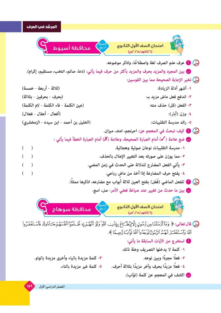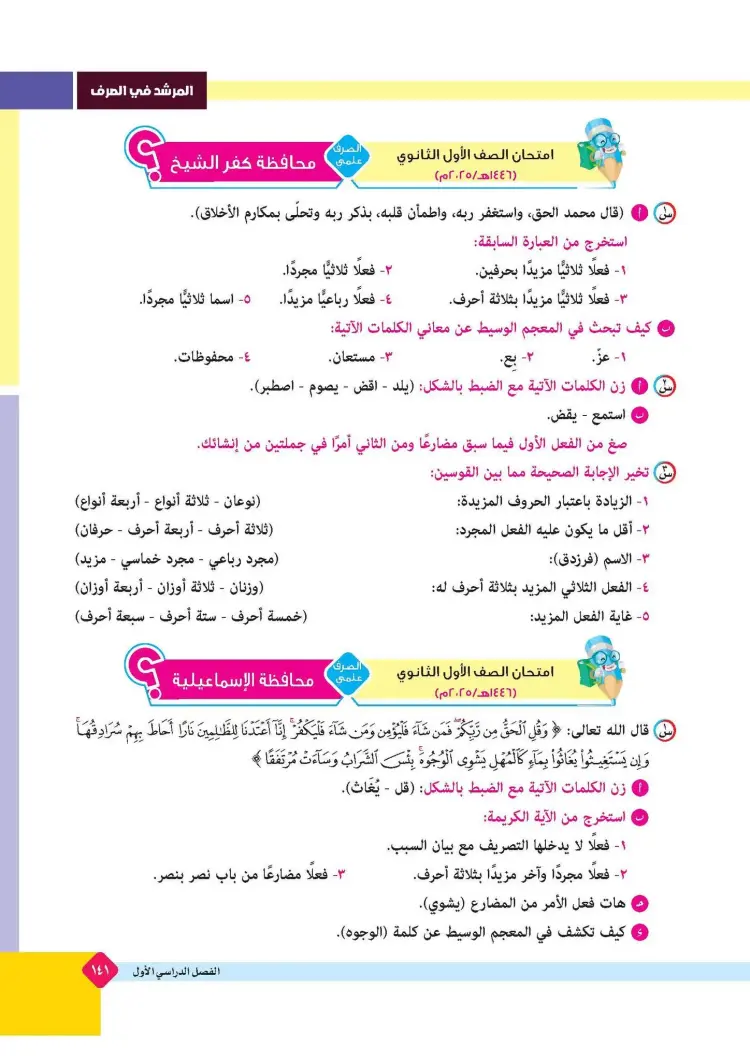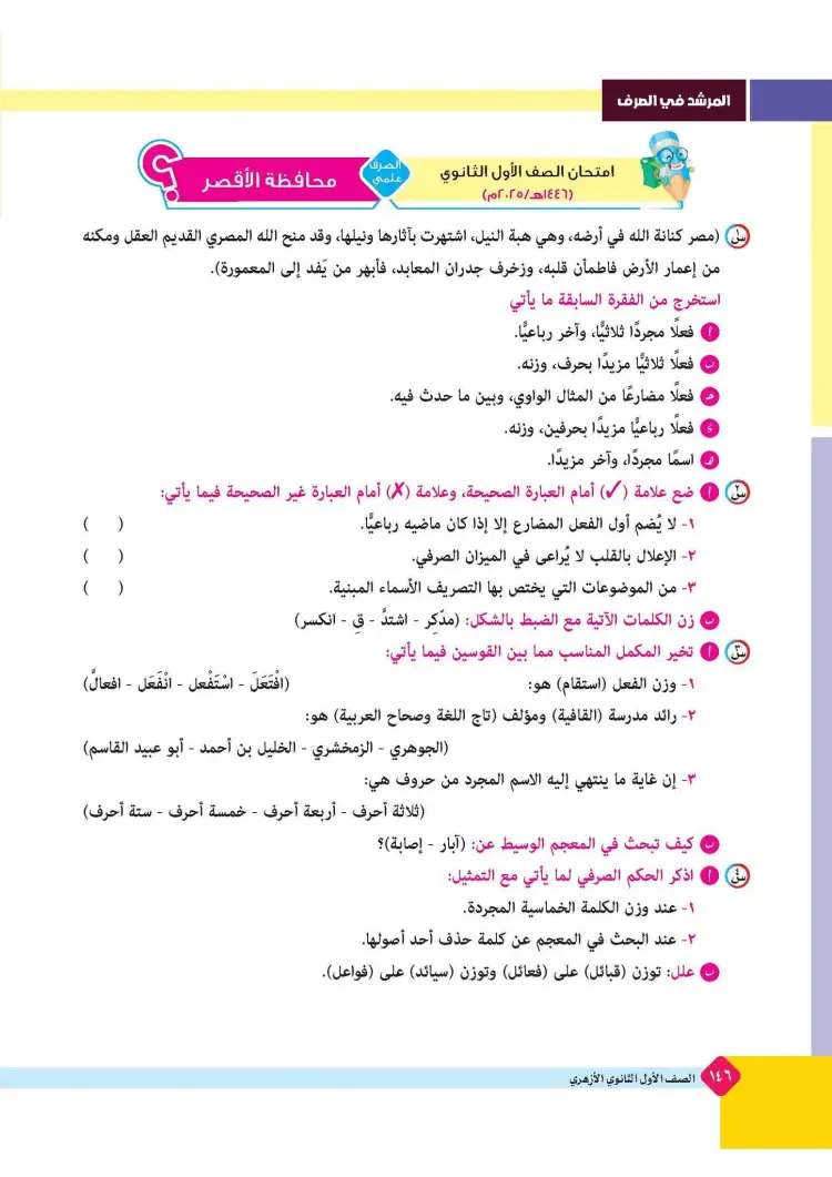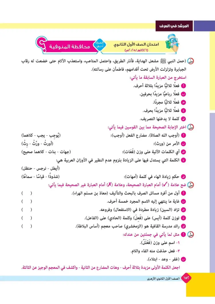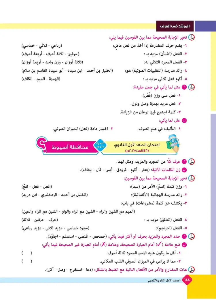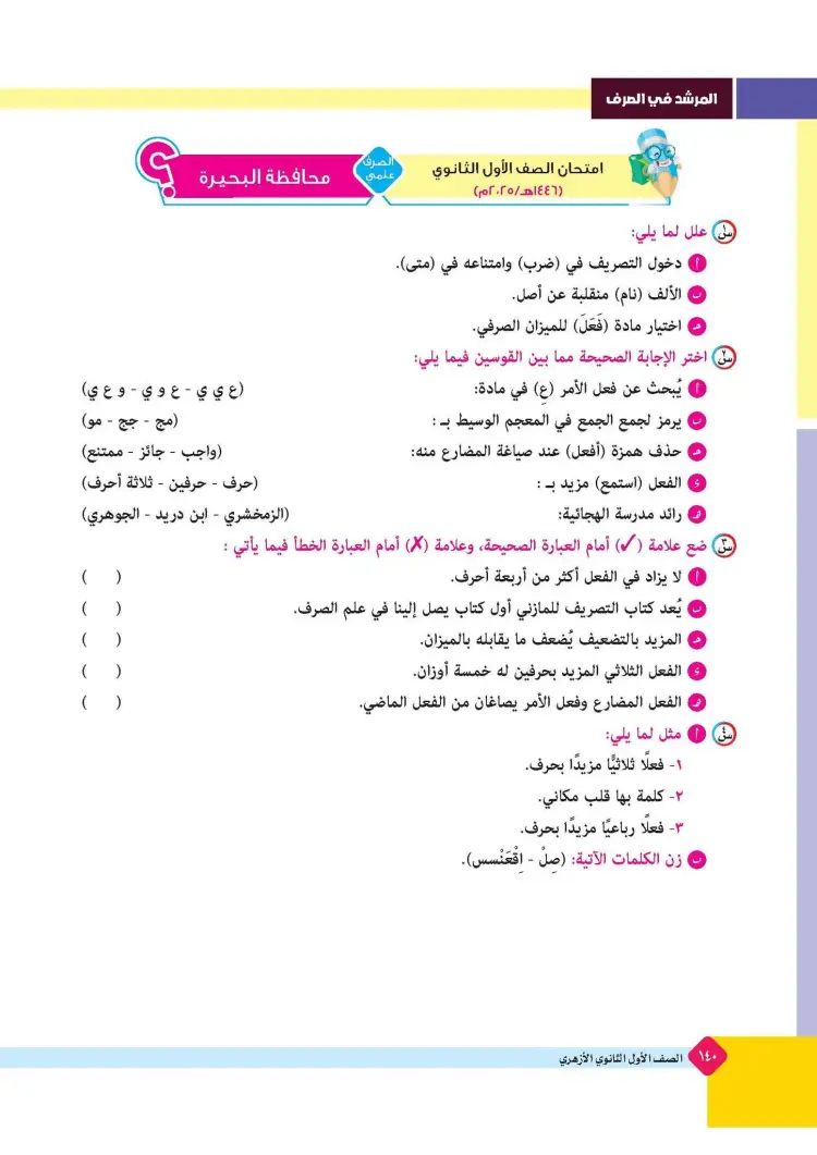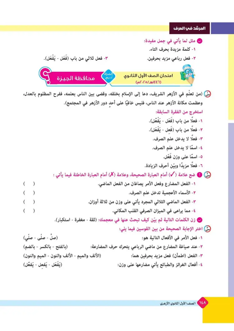ينشر «شبابيك» امتحانات كتاب المرشد في مقرر الصرف لطلاب الصف الأول الثانوي الأزهري علمي وأدبي بالفصل الدراسي الأول للعام 2025 2026، حتى يتثنى للطلاب التدرب على حلها.