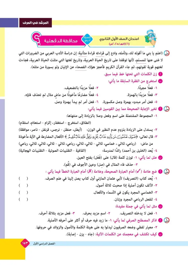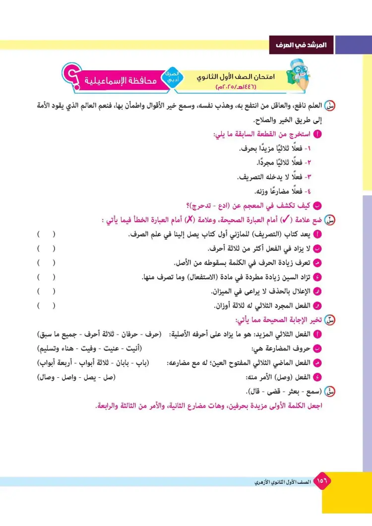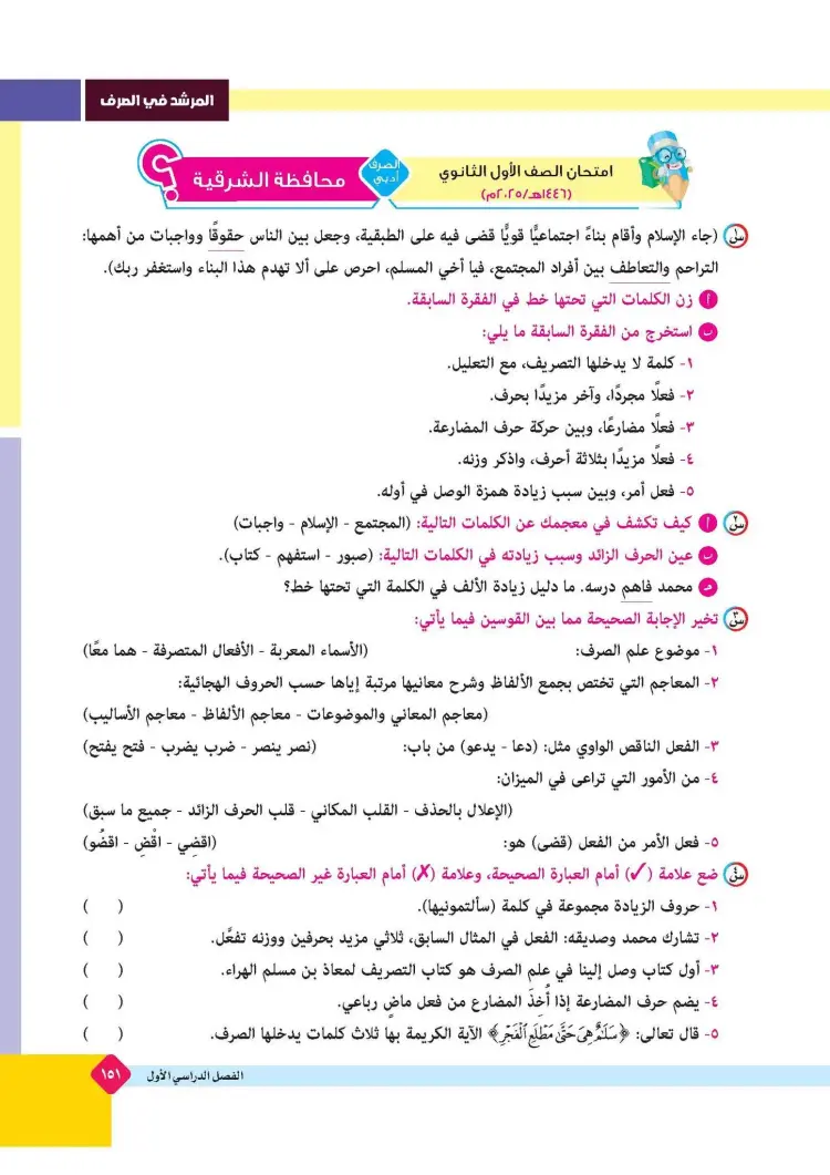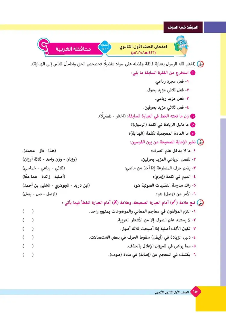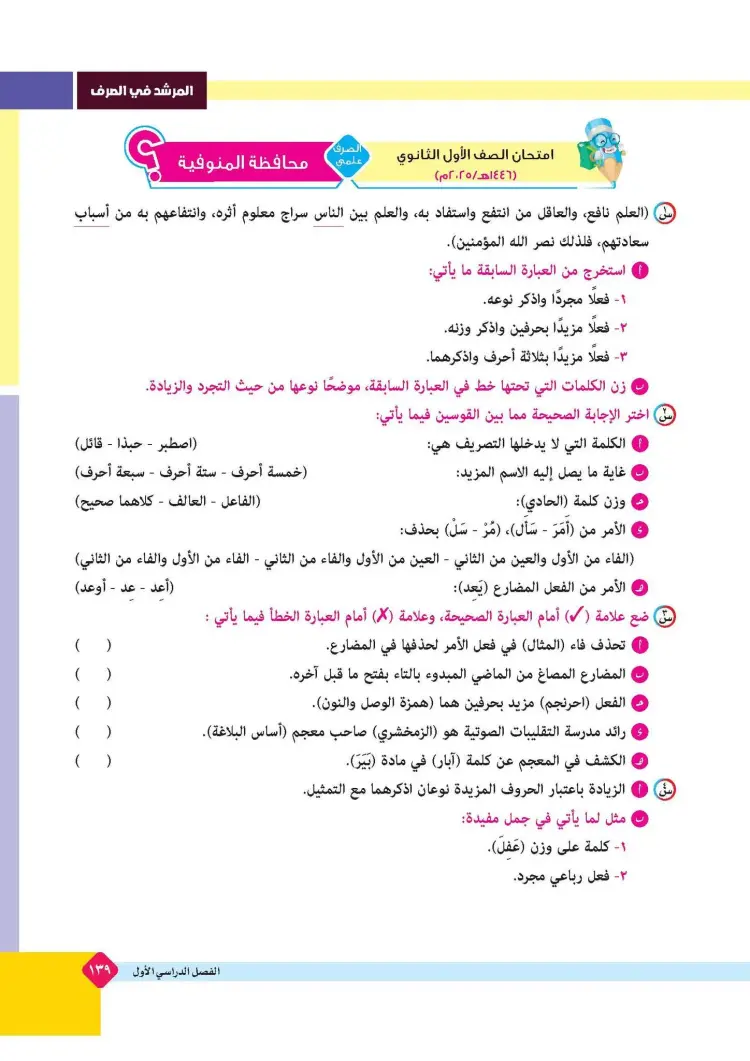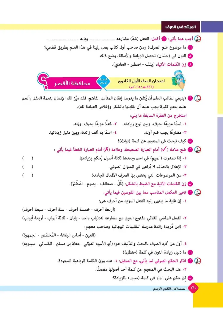 ينشر «شبابيك» امتحانات كتاب المرشد في مقرر الصرف لطلاب الصف الأول الثانوي الأزهري علمي وأدبي بالفصل الدراسي الأول للعام 2025 2026، حتى يتثنى للطلاب التدرب على حلها.