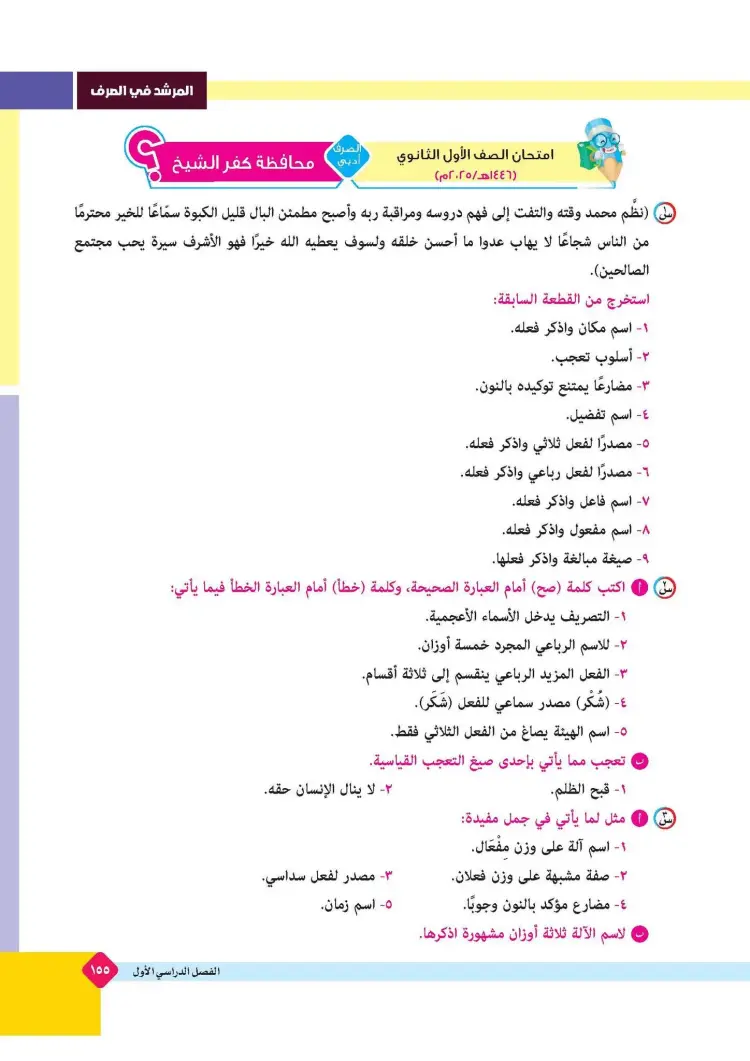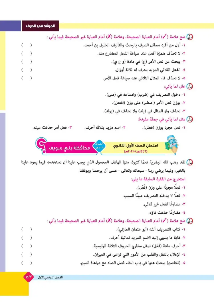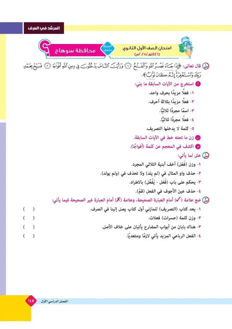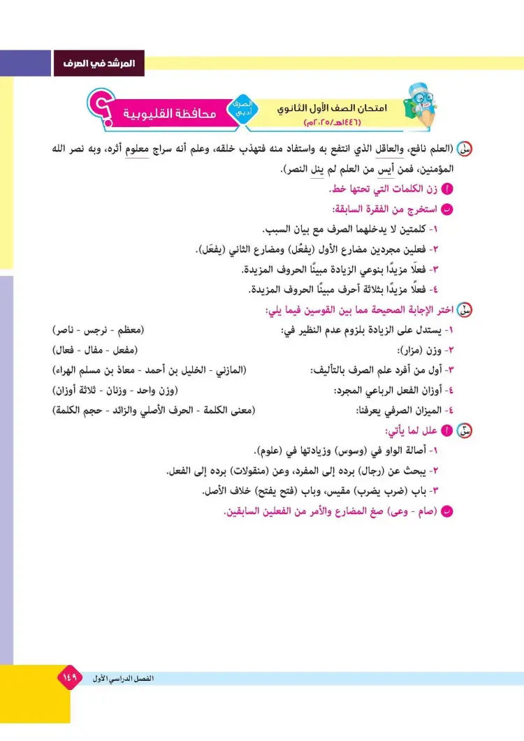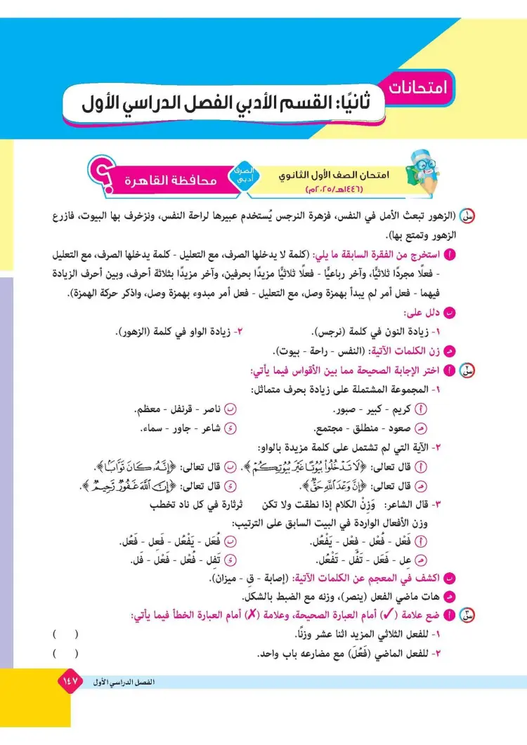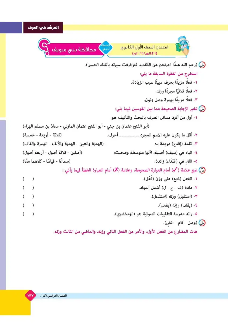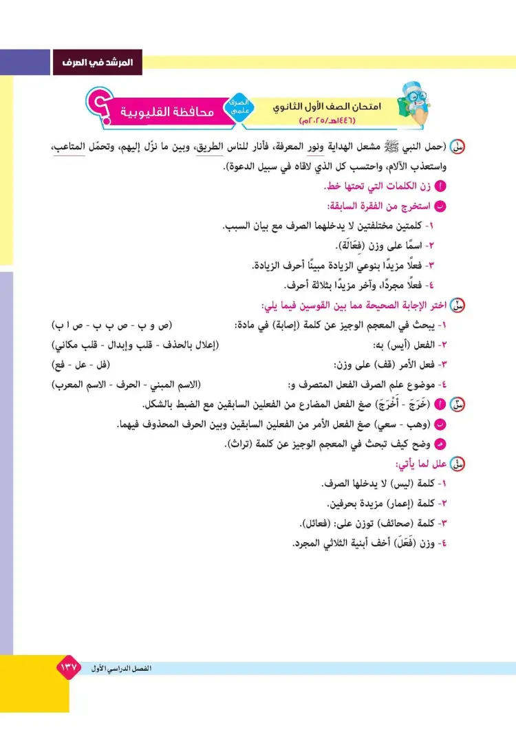 ينشر «شبابيك» امتحانات كتاب المرشد في مقرر الصرف لطلاب الصف الأول الثانوي الأزهري علمي وأدبي بالفصل الدراسي الأول للعام 2025 2026، حتى يتثنى للطلاب التدرب على حلها.